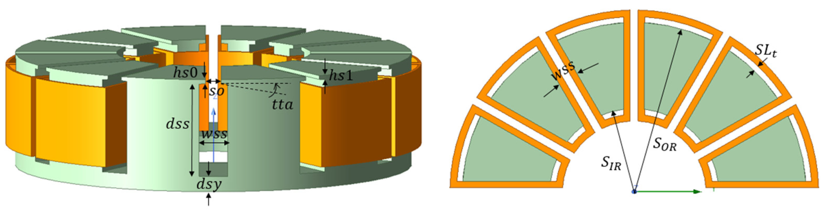 - Wu, L.; Ren, X.; Zhao, F.; Zhang, Z.; Ge, S.; Li, Y. A Novel Stator Tooth Shape of Axial Flux Permanent Magnet Motors Based on Soft Magnetic Composite for Torque Density Enhancement. IEEE Access 2025, 13, 144733–144744. [Google Scholar] [CrossRef]