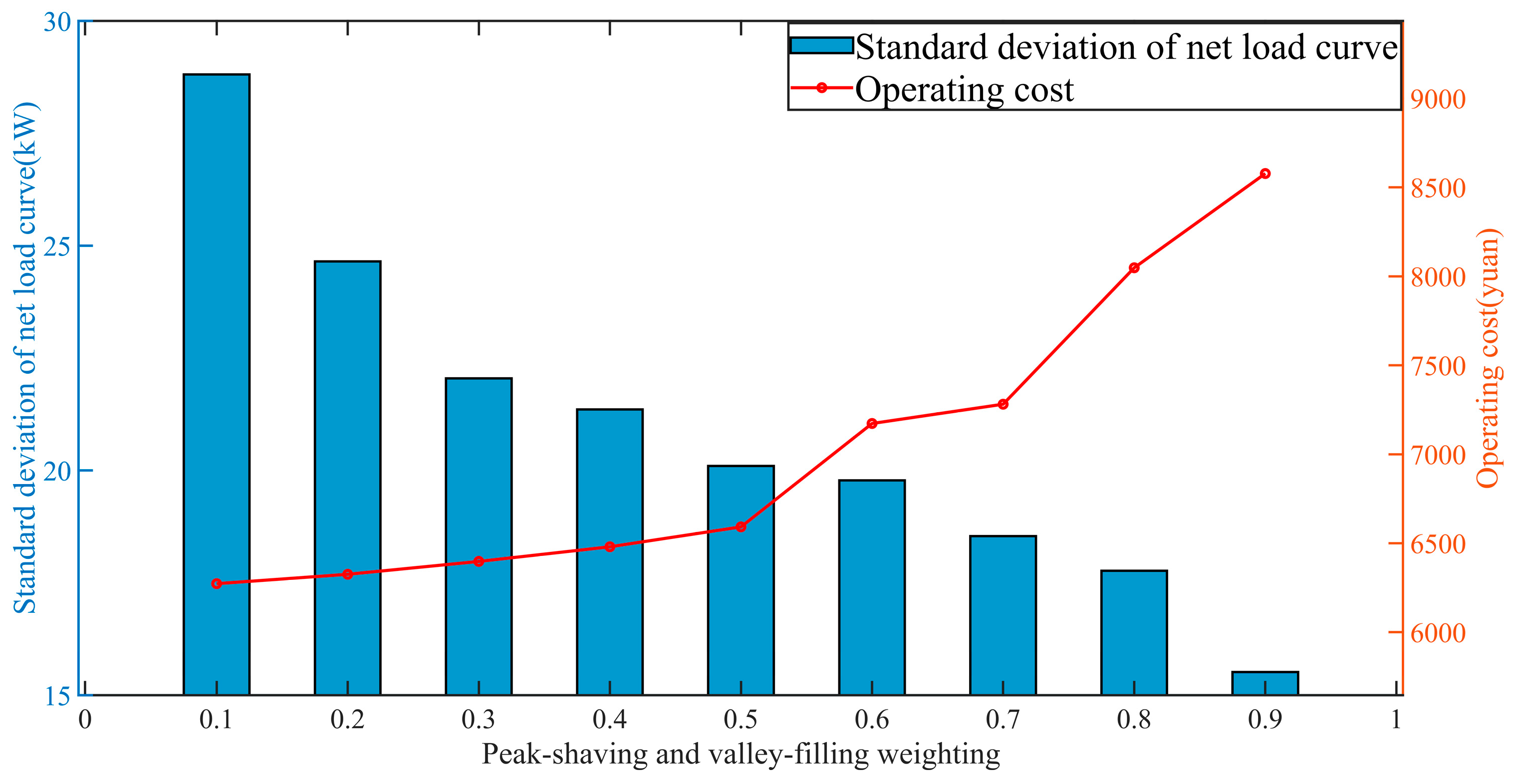 | Optimization Algorithm | Standard Deviation of Net Load Curve (kW) | Operating Cost (yuan) | Operating Cost (EUR) | Operating Time (s) |