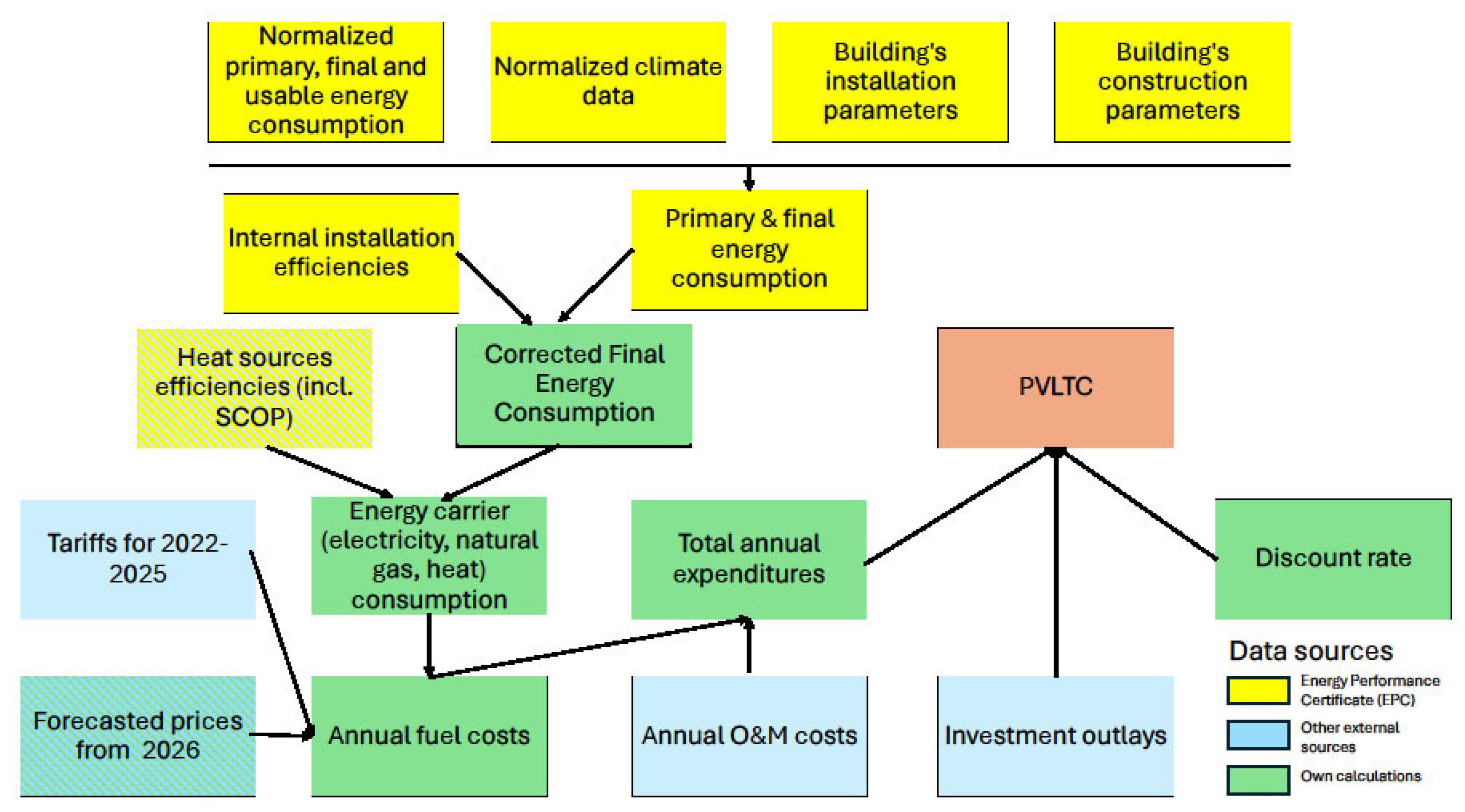 The purpose of the research was double-fold. Firstly, it was to evaluate, based on real tariffs for the years 2023–2025 and subsequent forecasts, the alternative sources available: the district heating system (DHS), the gas boiler supplied from the gas network (operated by PGNiG, PKN Orlen branch, Warsaw, Poland), and the air-to-water heat pump. The last option was analyzed in two scenarios: with and without PV installed. The second purpose was a universal one. Based on such a simple case, the authors intended to review methodologies commonly applied, to identify their deficiencies, and, finally, to identify or develop the most suitable one.