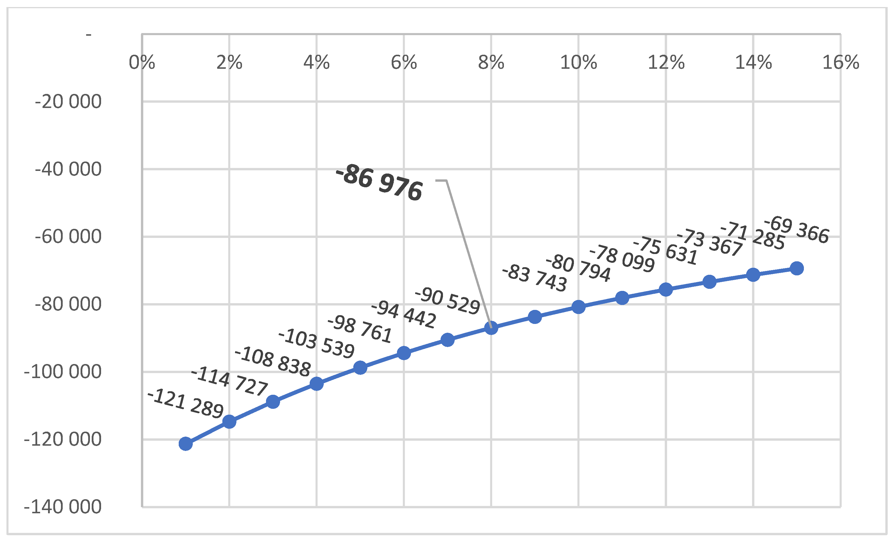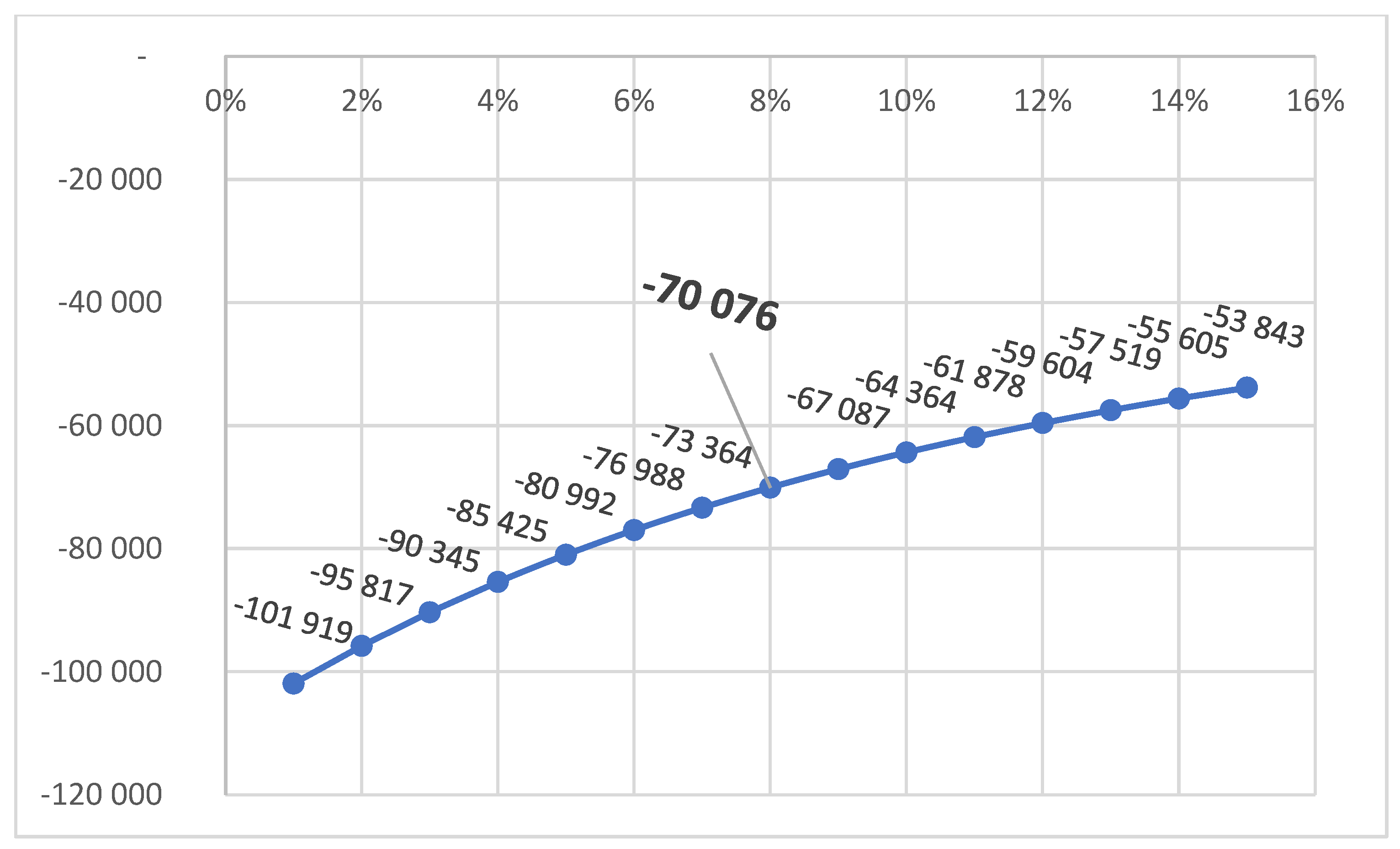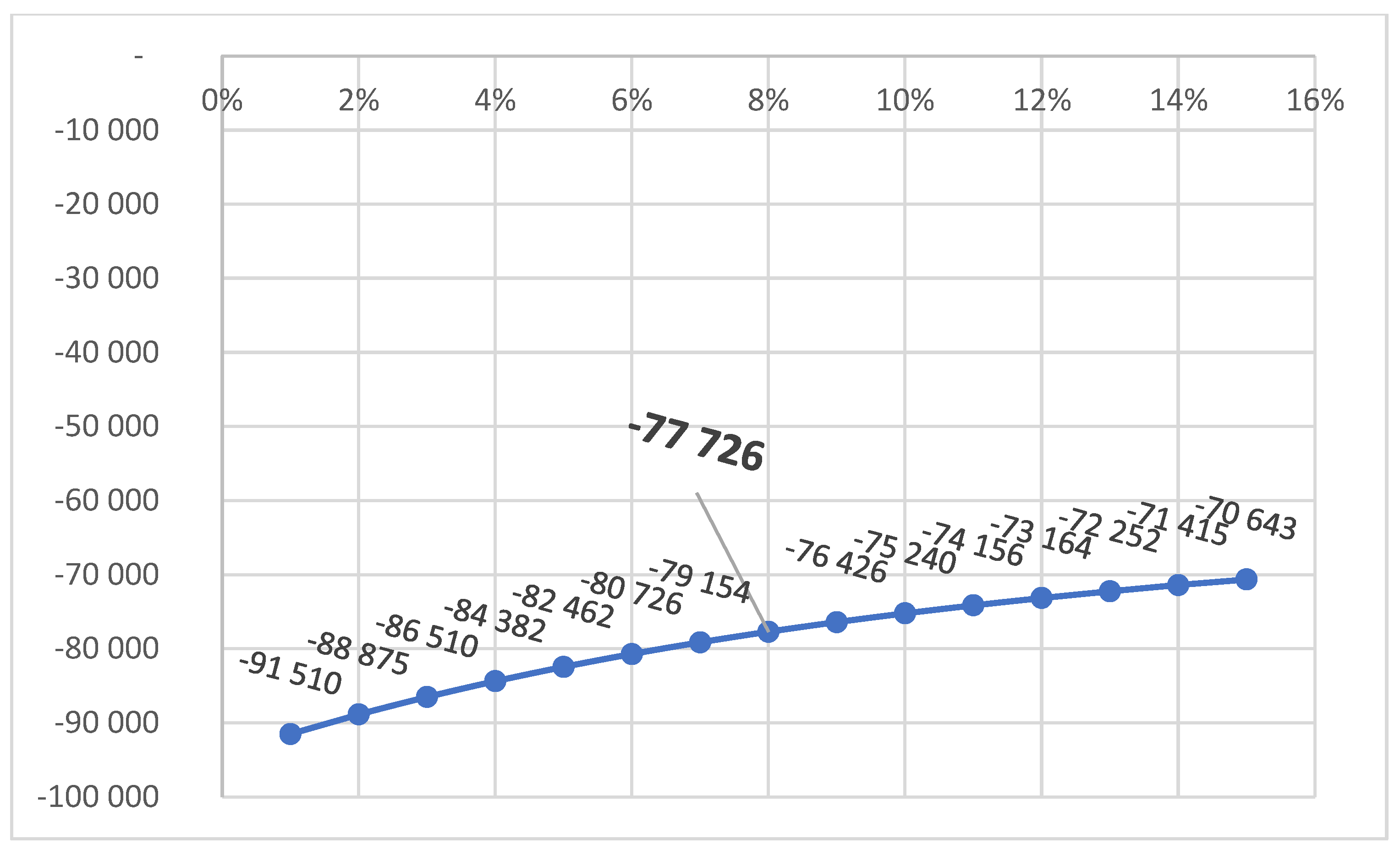 Two parameters that need to be established at the initial stage are the period under evaluation and the discount rate. When analyzing a business commercial project, its timeframe is established, taking into account various factors, like the forecasted lifetime of a product line, estimated technology, or turnaround cycle, as recommended by a machine manufacturer. Sometimes, if a project analysis is presented to capital providers, they determine their payback period, requiring that some margin be added to it. In the case of consumers, similar factors should be considered, but taking into account their different perspectives. Typically, they treat undertaking activities in the area considered as a problem to be faced and expect a selected solution to remain in place as long as possible. Construction or installation work carried out in a place of living always exposes its residents to a high level of discomfort. On the other hand, the period defined should allow us to compare the full lifecycle(s) of all solutions evaluated. One extreme is represented by a district heating system, which, from the customer perspective, typically requires relatively small, if any, initial investment and then can be considered perpetual. On the opposite side, there are individual gas boilers. Such complexity requires an arbitrary approach. Consequently, the period under analysis was defined as 15 years, commencing in 2022, when the house was constructed. As such, a long series of data would make tables unreadable; they present only the first 9 years (till 2030), while the remaining period is reflected in the residual value. Similar difficulties refer to setting the discount rate. Typically, analysts attempt to identify, either directly or indirectly, a shadow set of investment options with known rates of return and adjust them for the case under consideration. Another common technique refers to the so-called Weighted Average Cost of Capital (WACC), trying to establish a cost of financing for the given project. Such an approach cannot be mechanically applied to non-commercial undertakings. Customers finance investments in residential buildings either from their own savings or by using debt instruments. In the former case, an alternative is commonly represented by bank deposits and by private bank loans in the latter case. The problem is that, in terms of rates, these two options represent extremes among financial instruments. Bank deposits carry very low interest rates, sometimes even equal to 0%. On the other hand, consumer loans are usually among the highest-priced products, with the best offers starting at 10%. According to the authors, the best proxies are mortgages. In many cases, lenders are allowed to use this source of financing not only for a purchase but also for additional work, including the installation of heating sources.