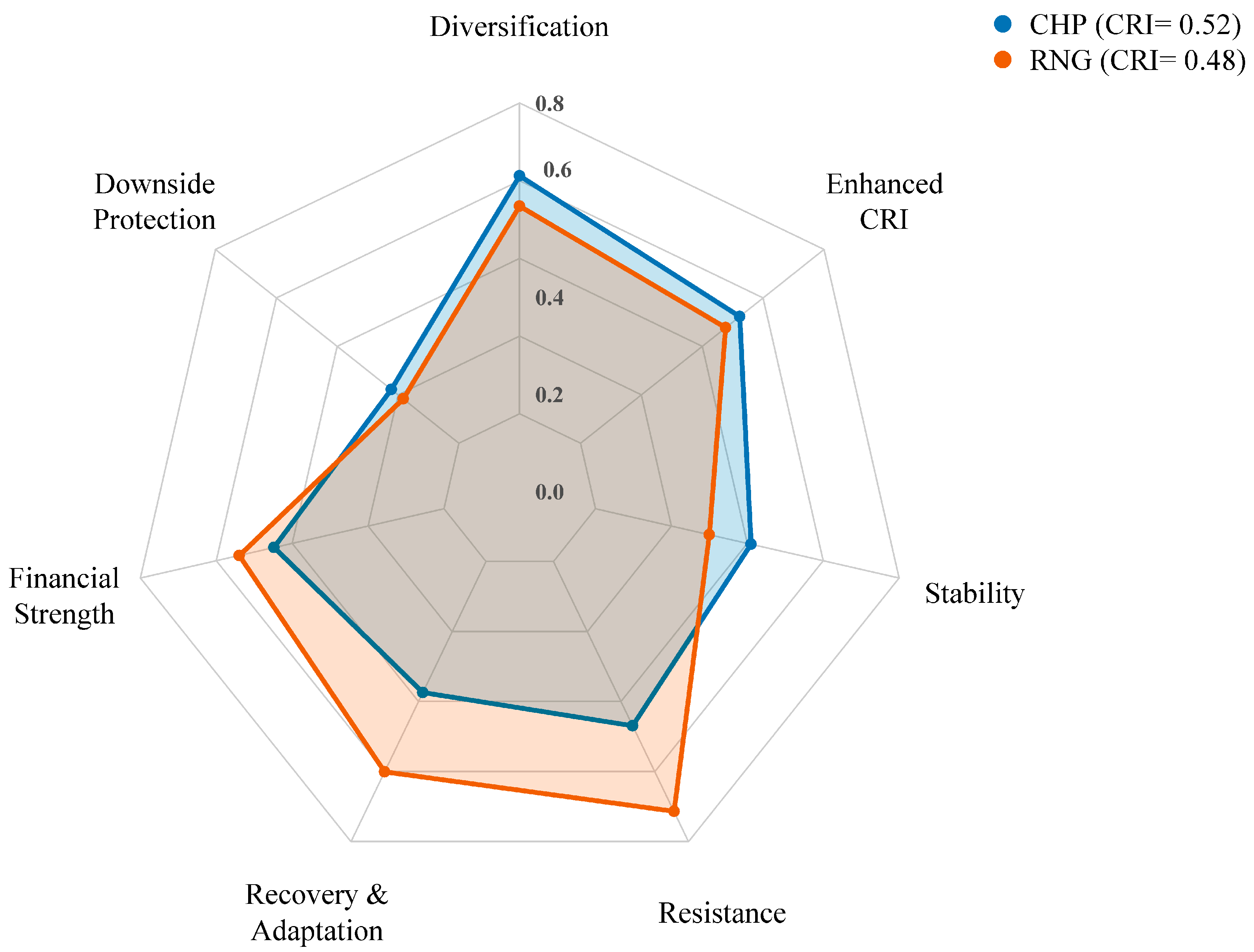 Table 2 by visualizing the complete resilience topology across all seven assessment dimensions simultaneously. The radar chart revealed a distinct dimensional pattern that explained the aggregate CRI inversion: RNG exhibited a “peaked” profile with exceptional performance in resistance (0.714) and recovery (0.601) dimensions but critical weaknesses in stability (0.512) and shock resistance (0.289). In contrast, CHP demonstrated a more “balanced” profile with moderate-to-strong performance across all dimensions, particularly excelling in stability (0.688) and diversification (0.613). This visual representation made immediately apparent that CHP’s resilience advantage stems not from superior performance in any single dimension, but from avoiding the catastrophic vulnerabilities that characterize RNG systems when facing their specific risk exposures.