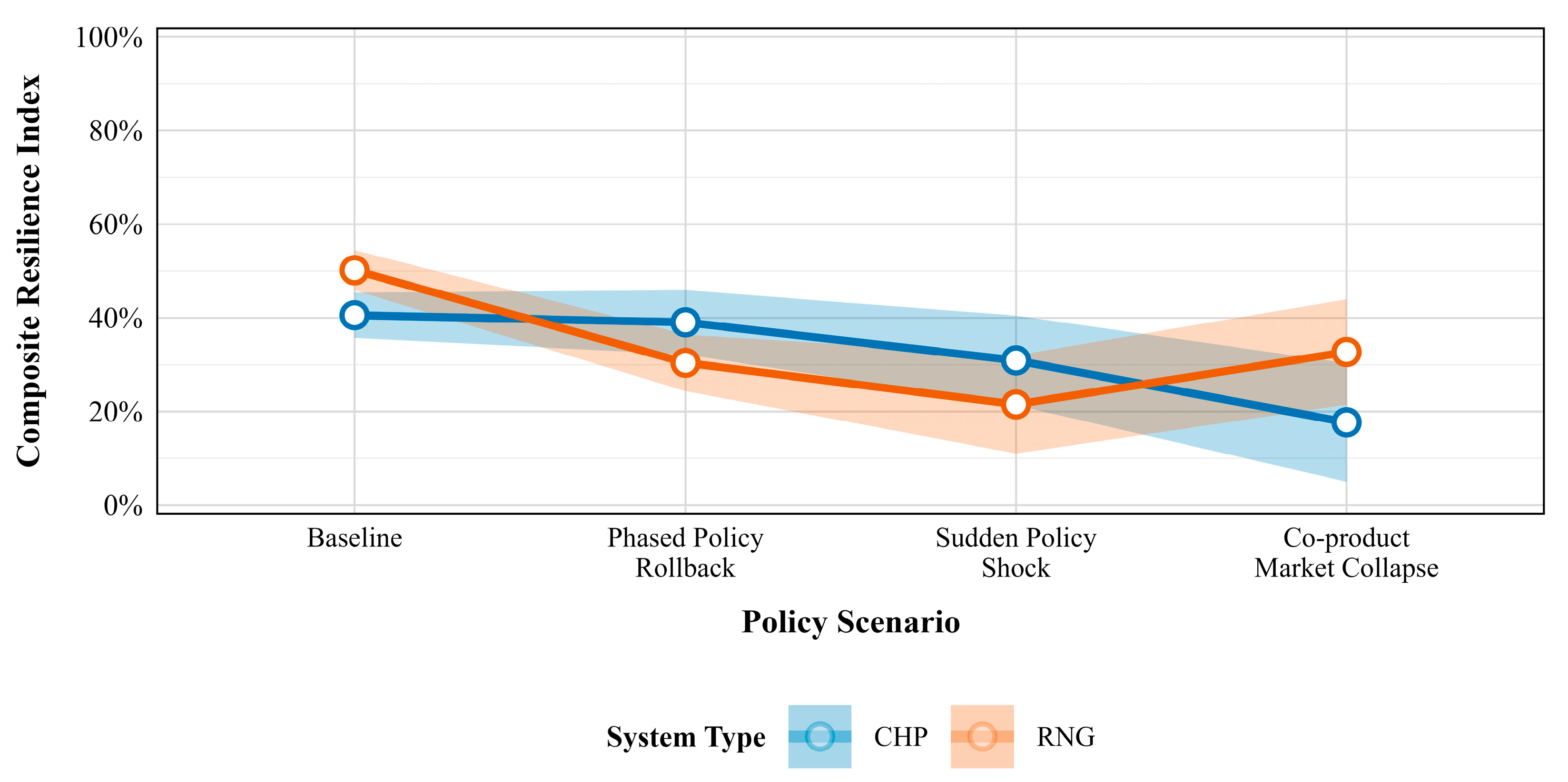 This analysis demonstrated that each system has a distinct “Achilles’ heel”: RNG’s resilience is highly vulnerable to policy stability, while CHP’s resilience is critically dependent on co-product market stability.
