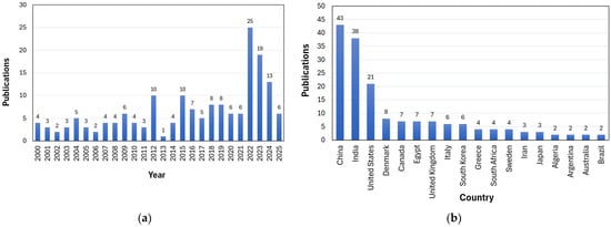 Figure 1 shows the thematic keyword map generated with VOSviewer software version 1.6.20 [7]. Three main clusters were identified: (i) flywheel energy storage and efficiency, linked to hybrid systems and electric power applications; (ii) battery storage and frequency regulation, associated with charging, management, and control strategies; and (iii) power systems and frequency control, connected to renewable integration, microgrids, and optimization methods. These clusters confirm that studies in the field focus on the complementary roles of BESS and FESS in frequency stability. Figure 2a illustrates the evolution of publications between 2000 and 2024. During the early years, research output was limited, with fewer than ten studies per year, then increased gradually after 2016, reaching a maximum in 2022 with more than 25 publications. Although there was a decline in 2023 and 2024, the number of studies remains higher than in the initial period, confirming the growing importance of hybrid energy storage for system stability. Figure 2b shows the distribution of publications by country. China, India, and the United States lead research, followed by Denmark, Canada, Egypt, the United Kingdom, and Italy. In contrast, Latin America is underrepresented, with only Argentina and Brazil reporting two publications each, highlighting the lack of regional contributions.