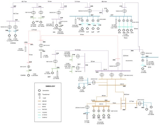 This research relied on an UNAH dataset based on the Honduran power system network. The information consisted of Excel spreadsheets containing technical specifications of buses, transmission lines, transformers, loads, and generating units, along with a general single-line diagram of the national interconnected grid, as presented in Figure 3. The overall system can be summarized as follows: