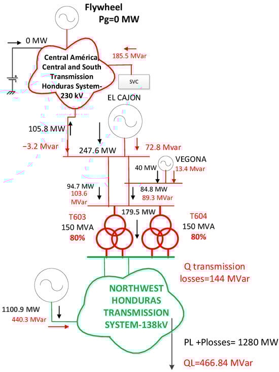 Figure 4 illustrates the main 230 kV transmission network in Honduras. Within this system, the ‘El Cajón’ hydroelectric plant is highlighted as the country’s most significant generation facility, both in terms of installed capacity and its critical role in the operation of the national power grid. This plant serves a strategic function as the interconnection point between the central–southern network, operating at 230 kV, and the northwestern network, which operates at 138 kV. The interconnection between these two sections is enabled through power transformers located at El Cajón, which facilitate energy transfer across different voltage levels and ensure the operational integration of the system.