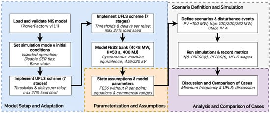 This methodology provides a systematic framework for evaluating the performance of BESS and FESS in mitigating frequency deviations during islanded operation. The approach ensures consistency between model configuration, control implementation, and metric assessment, offering practical insights applicable to similar low-inertia grids across the Central American region.
