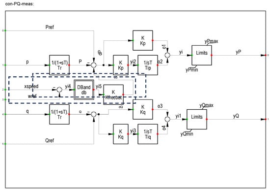 The battery model in DIgSILENT PowerFactory already includes a generic scheme for active and reactive power control. However, for this study, an enhancement was introduced to ensure a dynamic battery response during frequency events. The additional logic, directly embedded into the existing control structure (see Figure 6), is organized in three stages. First, the speed (w) is measured in p.u. through the variable xspeed (which is the variable that represents the speed in Figure 6) and compared against the nominal reference (wref = 1 pu). The deviation passes through a dead-band block of ±0.5 Hz, preventing unnecessary responses to minor fluctuations. If the deviation exceeds this band, the signal is amplified by a proportional gain (Kfrecbat = 50). This output is then fed into the active power controller, enabling the battery to inject or absorb power only when justified by significant frequency drops.