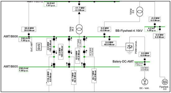 In the central–southern network, the Amarateca substation is identified as the reference point for the present study. For modeling purposes, this substation has been selected as the integration node for compensation and storage devices. Specifically, the model incorporates a Static Var Compensator (SVC), a 75 MW battery energy storage system (BESS), and a flywheel energy storage system (FESS). It should be emphasized that these devices are not part of the existing infrastructure at Amarateca; rather, they represent a conceptual configuration used within the simulation framework. The aim is to analyze the dynamic performance of the system and its ability to withstand instability events under different operating conditions.