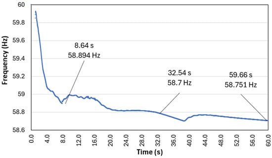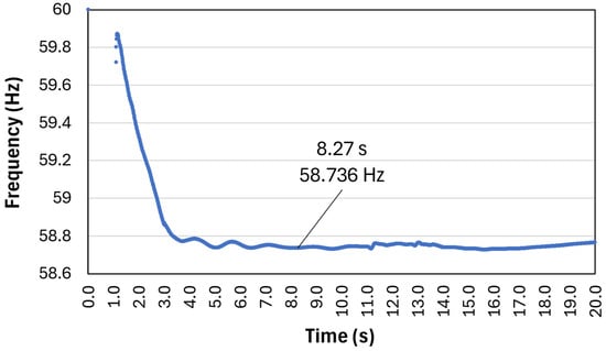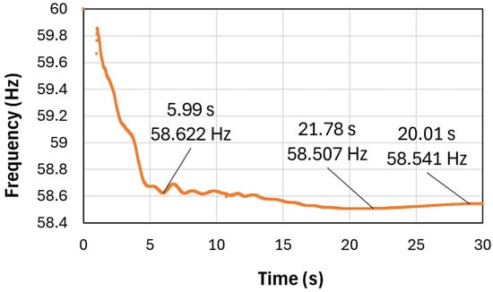In the first scenario, the National Interconnected System (NIS) operates in islanded mode without storage technologies, relying solely on El Cajón’s spinning reserve and the Under-Frequency Load Shedding (UFLS) scheme. A sudden loss of 100 MW was simulated, producing a frequency drop that reached a minimum of 58.700 Hz (Figure 8). Despite UFLS activation, which triggered the penultimate stage, and the response of El Cajón, the frequency only recovered to 58.751 Hz. This behavior highlights that the current system capacity is insufficient to restore secure operating margins under contingencies of this magnitude.