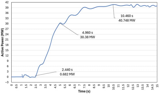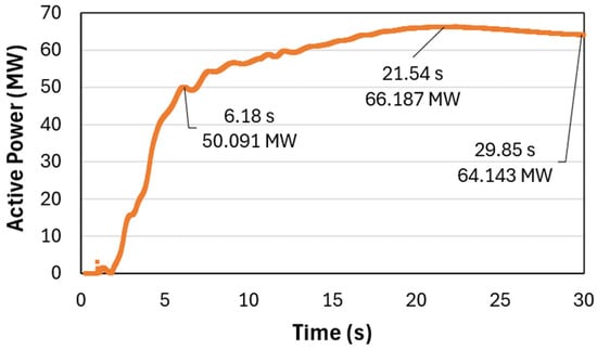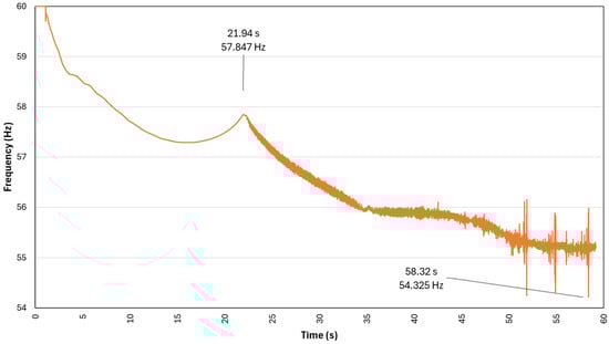 With the simultaneous integration of the 75 MW BESS and a bank of 40 flywheels, the NIS faced a 200 MW contingency with a faster response. The flywheels delivered a peak output of 137.03 MW at 2.55 s, although their contribution was short-lived (Figure 11). The minimum system frequency was 58.890 Hz, only 0.116 Hz higher than the case without flywheels (58.736 Hz), while the final stabilized value was 58.904 Hz, as presented in Figure 12. Although the improvement was minor, the flywheels alleviated the battery, reducing its maximum output from 51.37 MW to 40.82 MW (Figure 13). Nevertheless, UFLS stages were still activated, and the technical benefit remained limited.
