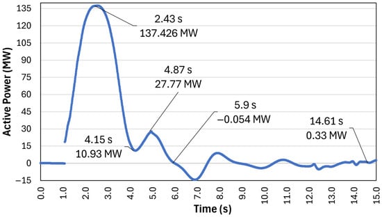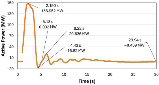 With the integration of the 75 MW Battery Energy Storage System (BESS) under a 200 MW generation loss, the system exhibited a significant improvement. The minimum frequency recorded was 58.736 Hz at 8.270 s (Figure 10), thus avoiding the 58.5 Hz threshold that would trigger UFLS protection. The battery delivered a maximum output of 51.37 MW at 16.81 s, demonstrating a fast and effective response. This intervention stabilized the system frequency without collapse. Moreover, due to the implemented control strategy, the battery sustained its discharge throughout the contingency, providing continuous support.