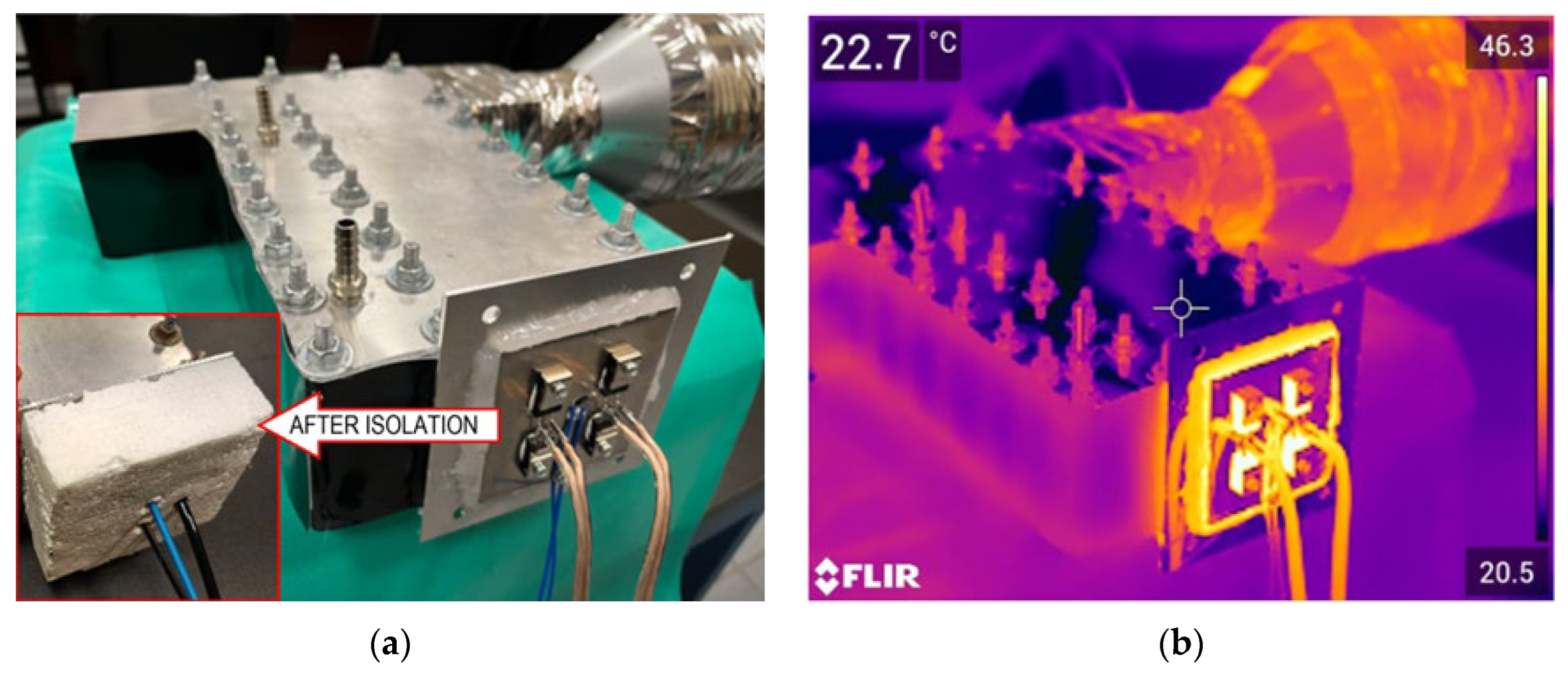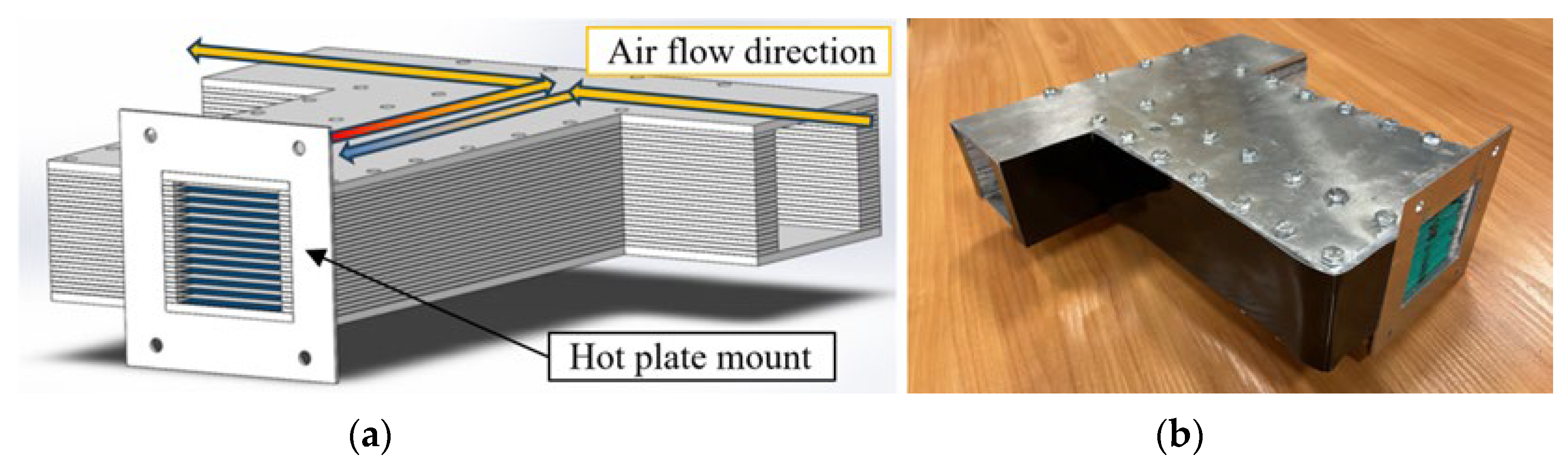 - High hydraulic resistance due to low channel height and the 180º air flow turn. This resulted in significant pressure losses, especially in wet channels, and led to the fan operating outside its design zone, energy overconsumption, and increased flow rate measurement errors. Means of pressure loss reduction should be considered, such as HMX channels’ geometry changes. To enhance experimental accuracy, it is recommended to proportionally increase the dimensions of the cooled surface and heat exchanger. Also, for the next prototype, a more precise selection of fans and their performance characteristics should be made.
