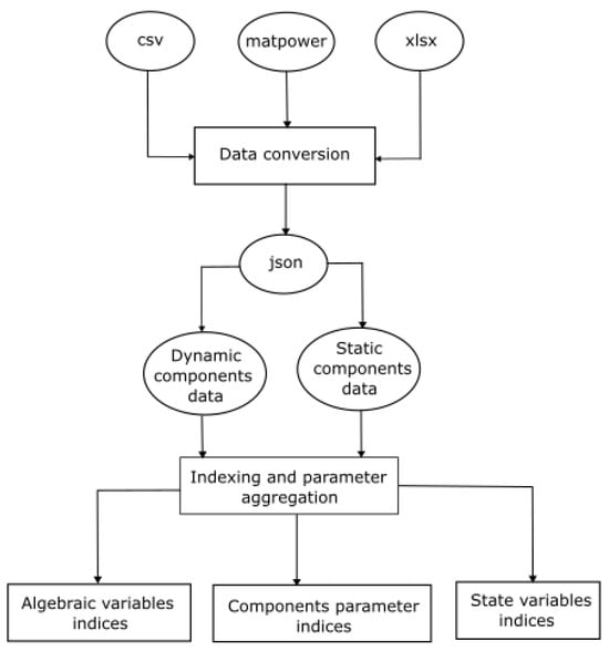 The indexing subunit is responsible for indexing components, state variables, algebraic variables, components parameters, and control variables. Data in various data format are first converted to json format as shown in Figure 2. The static components and dynamic components data are subsequently separated for the indexing of algebraic variables, components parameters, and state variables.