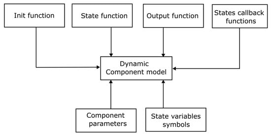 The symbolic name of a component type and its state variable are first declared. This information is subsequently added to the appropriate lists in the component state symbols library. Dictionaries are created to hold init, dynamic, and output functions. The keys of the dictionaries are symbols of the component names.