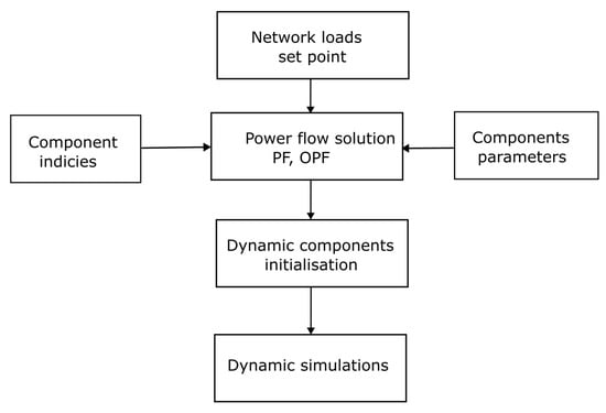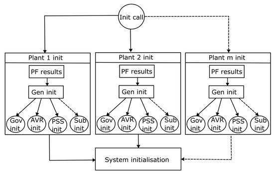 A snapshot of the processes involved in the system initialisation is shown in Figure 6 and Figure 7. A power flow set point is first calculated based on the operating parameter of a network. The results are then used for dynamic components initialisation as shown in Figure 6. The details of the dynamic components initialisation process are shown in Figure 7. The initialisation of a system starts with a call to the system init function. The system init function subsequently requests each dynamic device to initialise based on each device init function. In cases of components that have dynamic sub-components, the request is passed to sub-components to initialise based on each sub-component init function. The initialisation of each component and the sub-components initialisation state are aggregated by the system init unit for system initialisation.