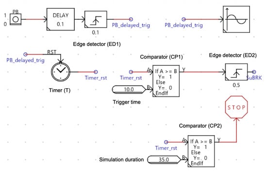 The runtime environment for the IEEE 9 bus and IEEE 16 bus test systems in RSCAD were modified to include a trigger unit to implement a sudden change in load at a bus. The trigger unit is shown in Figure 8. In general, the simulation time step in RTDS is 50 μs for the real-time simulation and integration of hardware-in-the-loop. Since the validation process is not meant to assess the real-time performance but the validity of the models, a few delays were introduced to ease simulation. The push button PB in Figure 8 triggers a close event of a circuit breaker in RSCAD Draft interface. When a push on PB is detected by an edge detect , the output of resets a timer (T). The output of the timer and trigger time serve as input to a comparator. Once the clock time exceeds the trigger time, a signal is sent to a circuit breaker to connect a load to a pre-determined bus. The load stays connected for the duration set in the edge detector with pulse duration . The pulse width of ED2 is set to . The simulation duration is determined by in combination with the output of timer T.