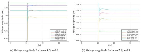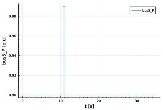 Similarly, dynamic model validation was conducted by a sudden increase and decrease in the active power demand at node 5 by within seconds as shown in Figure 9. The results obtained for the sudden perturbation of active power demand are presented in Figure 10a,b and Figure 11a,b. It can easily be seen that the result obtained from the package is in close agreement with the result obtained from RTDS.