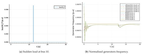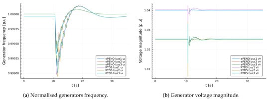 A sudden load change simulation in RTDS was conducted first; subsequently, the event time of the load change was determined to be . was then used as the event time for a sudden load change in ePowerSim.jl. The time step of output signals from ePowerSim.jl was set to in order to reduce the amount of output results without appreciably affecting the visualisation of the results. In addition, outputs from RTDS were down sampled to give of in order to align the results obtained in RTDS with the one obtained in ePowerSim.jl. The specification of the RTDS used for validation is provided in Table 1.