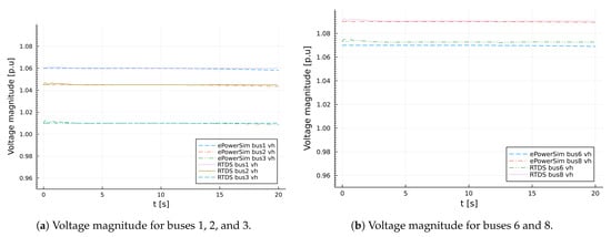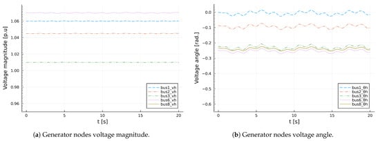 Similarly, Figure 19a depicts the data published by sdDynamicsHelicsSim federate: voltage magnitude , voltage phase angle , active power , and reactive power . Figure 19a,b are presented separately, in order to not obscure their details. It can easily be seen in the two figures that there is no difference between the data published by sdDynamicsHelicsSim and the subscription by DataReceiverHelicsSim.