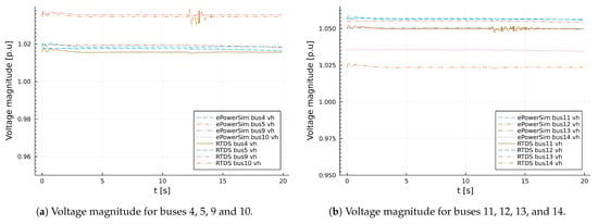 A dynamic model validation was also conducted by a sudden increase and decrease in the active power demand at node 10 by within seconds as shown in Figure 12a. The results obtained for the sudden perturbation of active power demand are presented in Figure 12, Figure 13 and Figure 14. An expanded view of change in frequency as a result of perturbation is shown in Figure 12b. It can easily be seen that the deviation in frequency during the steady state and system perpetuation are pu and pu. In addition, the result obtained from the package for voltage magnitude is in close agreement with the result obtained from RTDS, except for the voltage magnitude at bus 14. The difference in the values does not come from the dynamic characteristics of the model but the steady-state values (power flow). The values of the voltage magnitude at bus 14 based on ordinary power flow analysis for ePowerSim and RTDS are pu and pu, respectively.