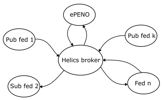 Co-simulation entails the simultaneous simulation of models of different entities with the coordination of data exchange between the entities through a broker. Helics.jl provides a framework for the co-simulation of models co-located on the same platform or different platforms. An instance of the simulation of a model on an entity is termed a federate. A simulation space of all federates and set of brokers that interact to exchange data is termed a federation. A federate may chose to publish data only (publication federate), subscribe to data only (subscriber federate), or publish and subscribe to some set of data (subscriber–publication federate). Figure 16 depicts federation for the co-simulation of five federates and a Helics broker. In Figure 16, fed 1 and fed k are publication federates; fed 2 is a subscriber federate; fed n and ePENO are publication–subscriber federates.