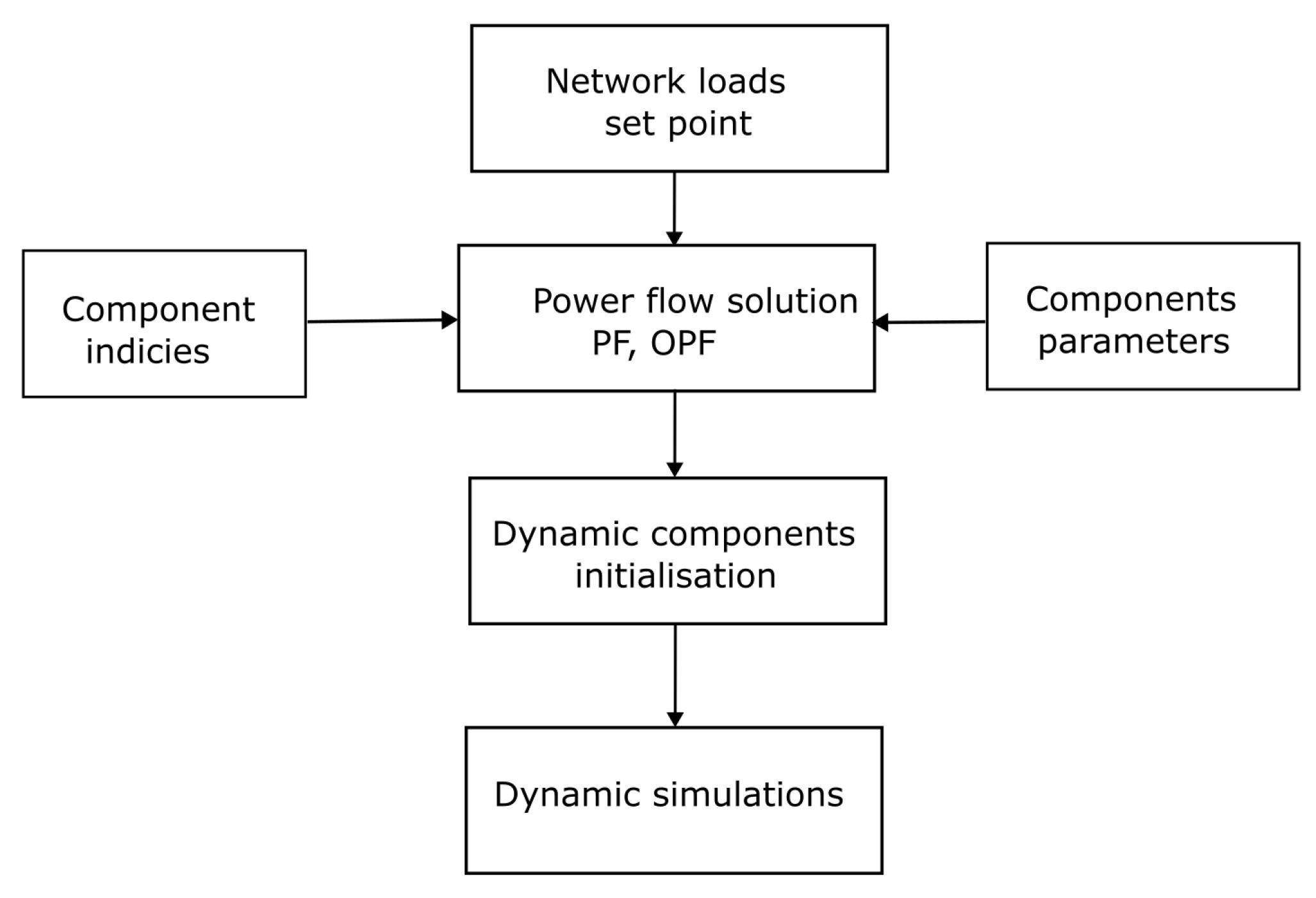 Figure 7. A power flow set point is first calculated based on the operating parameter of a network. The results are then used for dynamic components initialisation as shown in