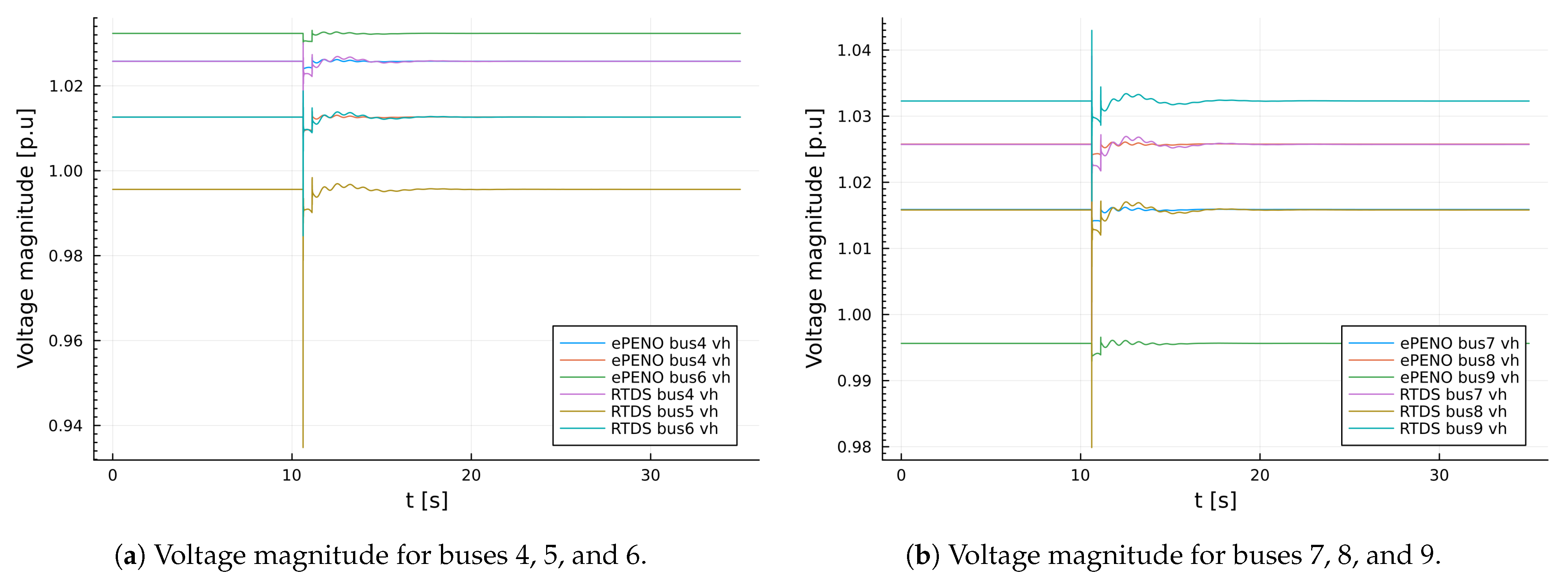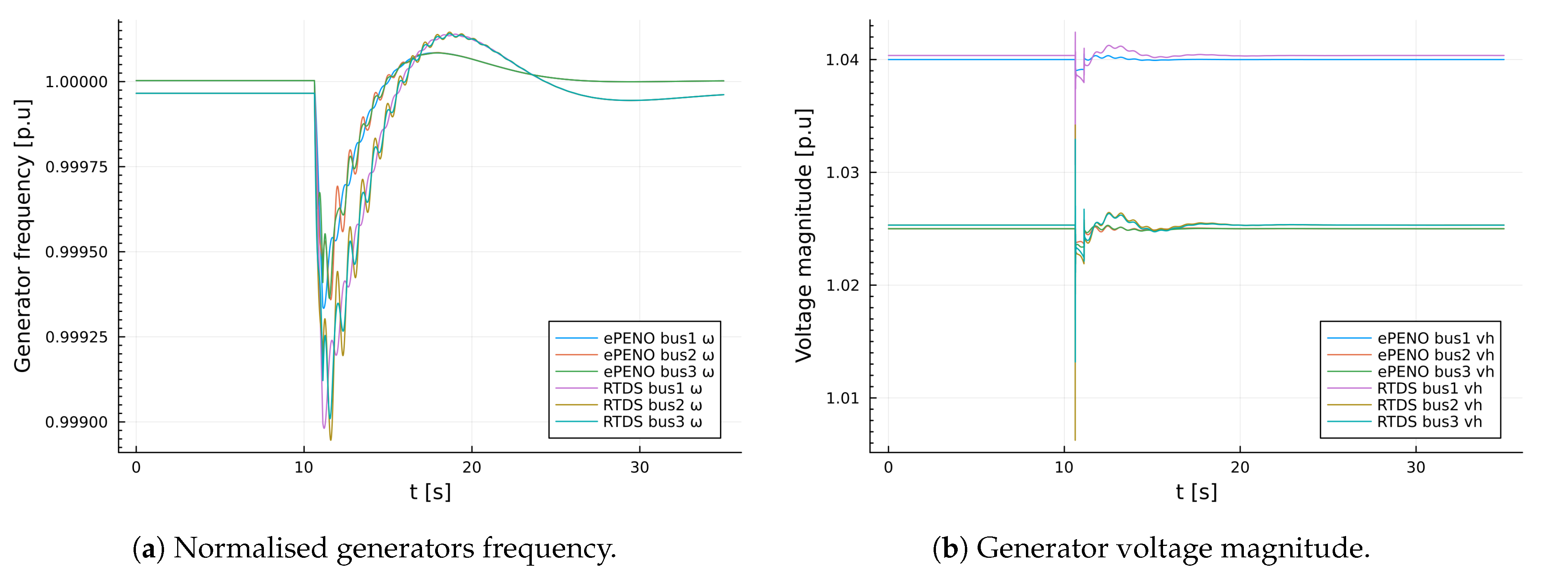 A validation process that was used to assess models of an electric power system in the package is presented in this section. The validation of models and output of simulations in the package were performed for both static and dynamic cases. The static performance validation was conducted by comparing the results of the ordinary power flow of IEEE 9 test systems obtained using the package with the result obtained from a real-time digital simulator for electric power systems (RTDS). The dynamic validation was conducted through a sudden increase in active power demand at a node in the IEEE 9 bus and IEEE 14 test systems. The results obtained from RTDS and the package were compared for validation purposes.