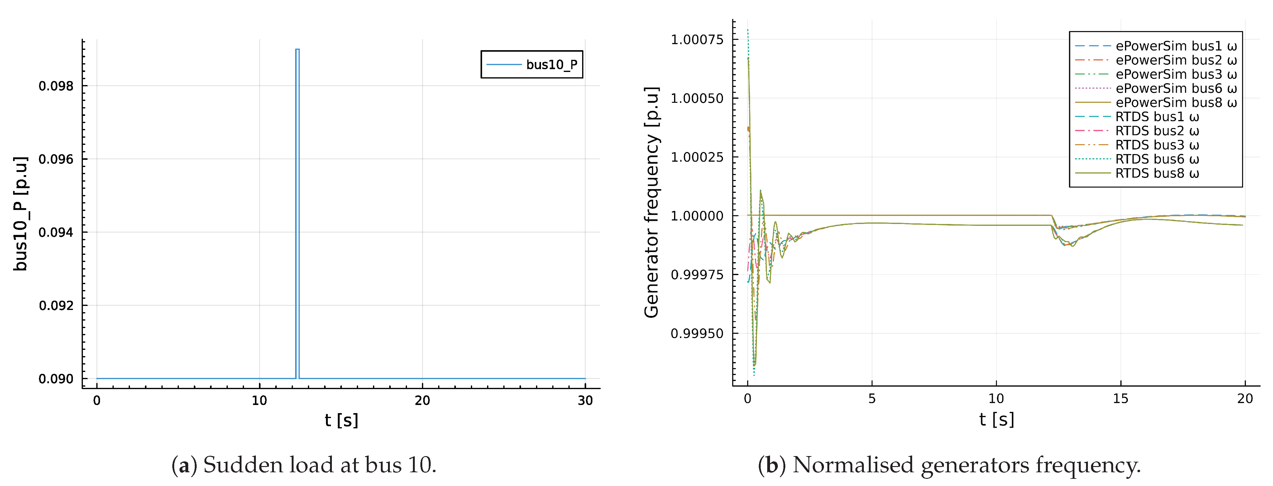 A close match between the results obtained in the simulation of an electric power system static and dynamic models in ePowerSim.jl and a real-time digital simulator during validation indicates that the package can be used for experimentation where there is no need for hardware-in-the-loop.