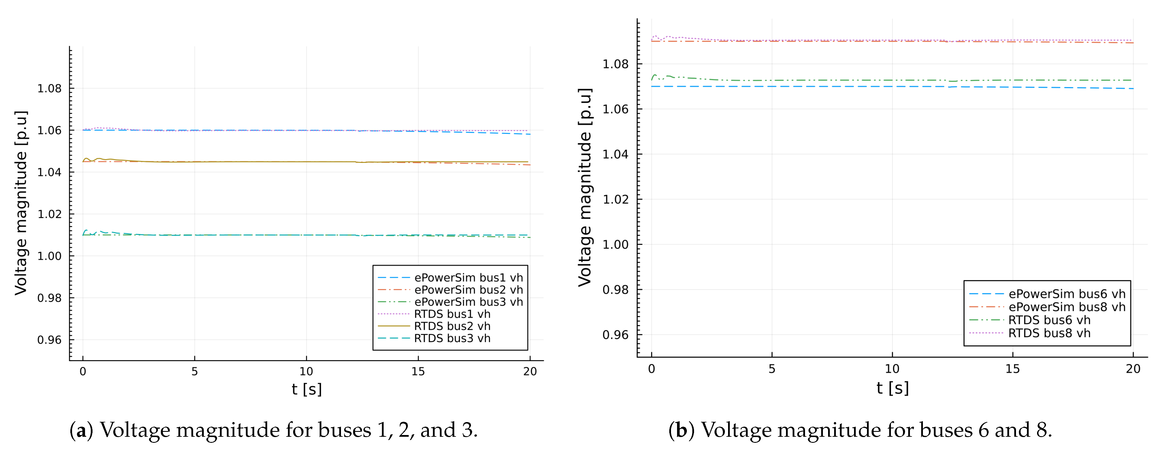 31]. Although the phase angle of the slack bus in RTDS result is −30.00°, this does not introduce any significant discrepancies since the relative phase angles of all buses voltages to the phase angle of the slack bus voltage is the same for the results obtained by the package.