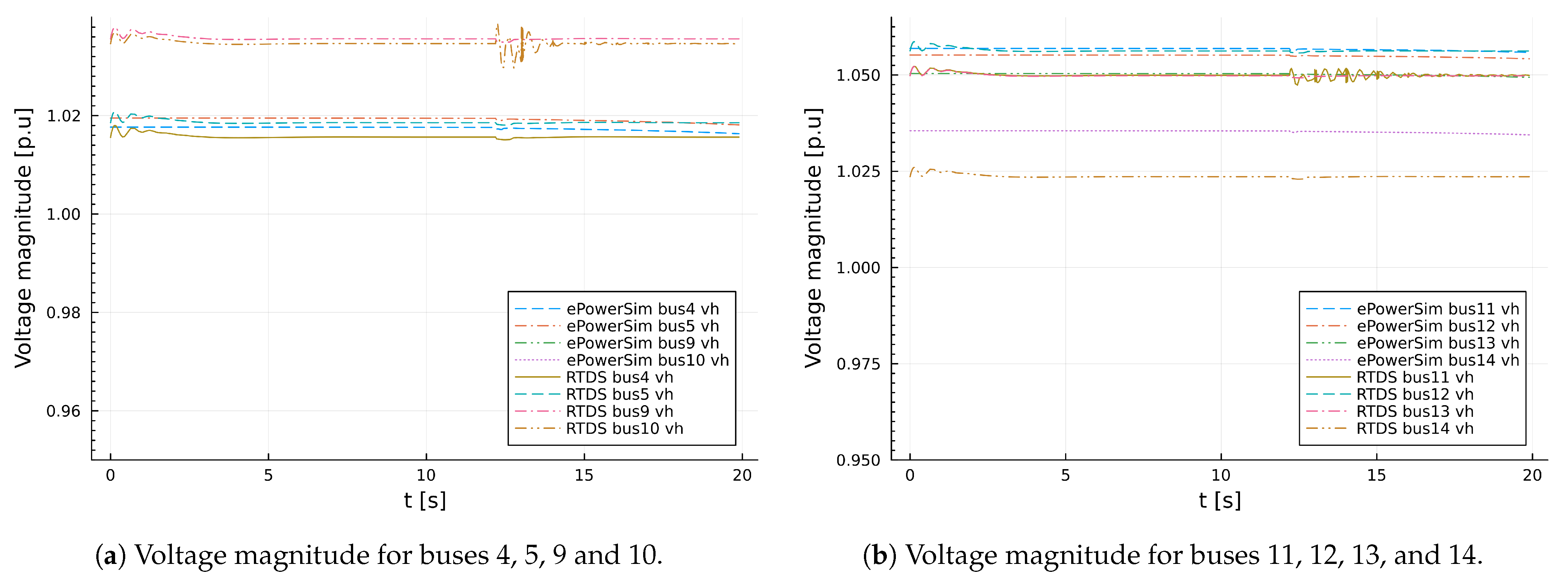pu. In addition, the result obtained from the package for voltage magnitude is in close agreement with the result obtained from RTDS, except for the voltage magnitude at bus 14. The difference in the values does not come from the dynamic characteristics of the model but the steady-state values (power flow). The values of the voltage magnitude at bus 14 based on ordinary power flow analysis for ePowerSim and RTDS are