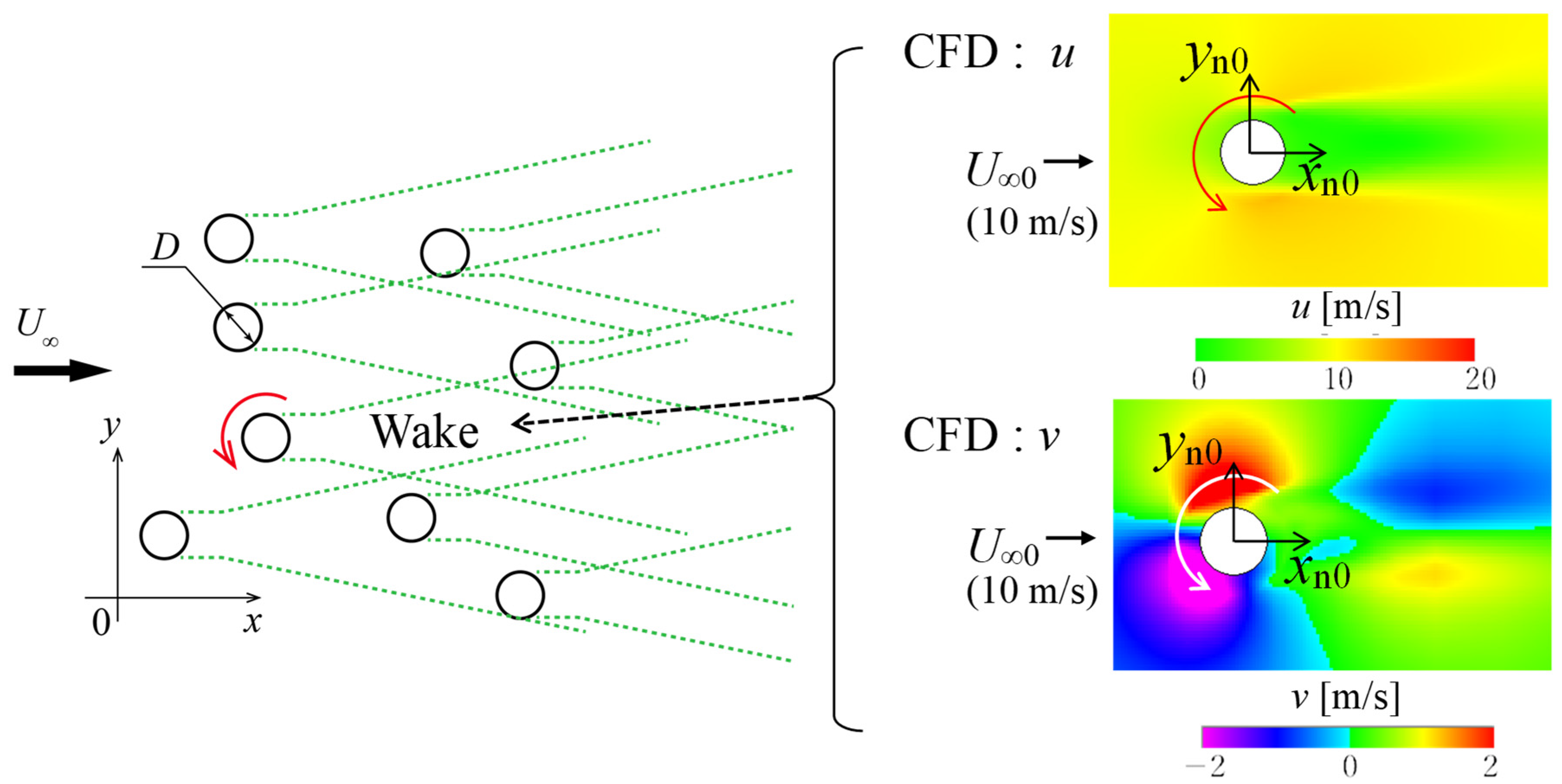 - Hara, Y.; Moral, M.S.; Ide, A.; Jodai, Y. Fast simulation of the flow field in a VAWT wind farm using the numerical data obtained by CFD analysis for a single rotor. Energies 2025, 18, 220. [Google Scholar] [CrossRef]