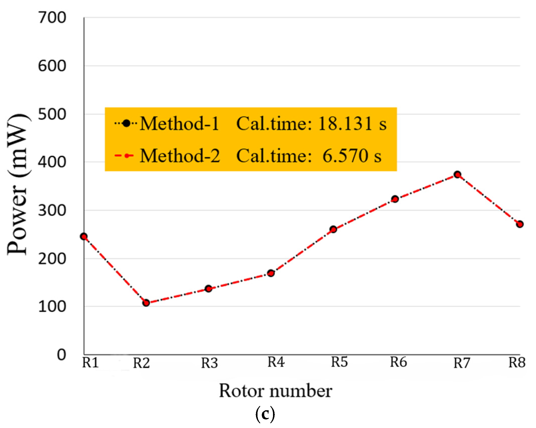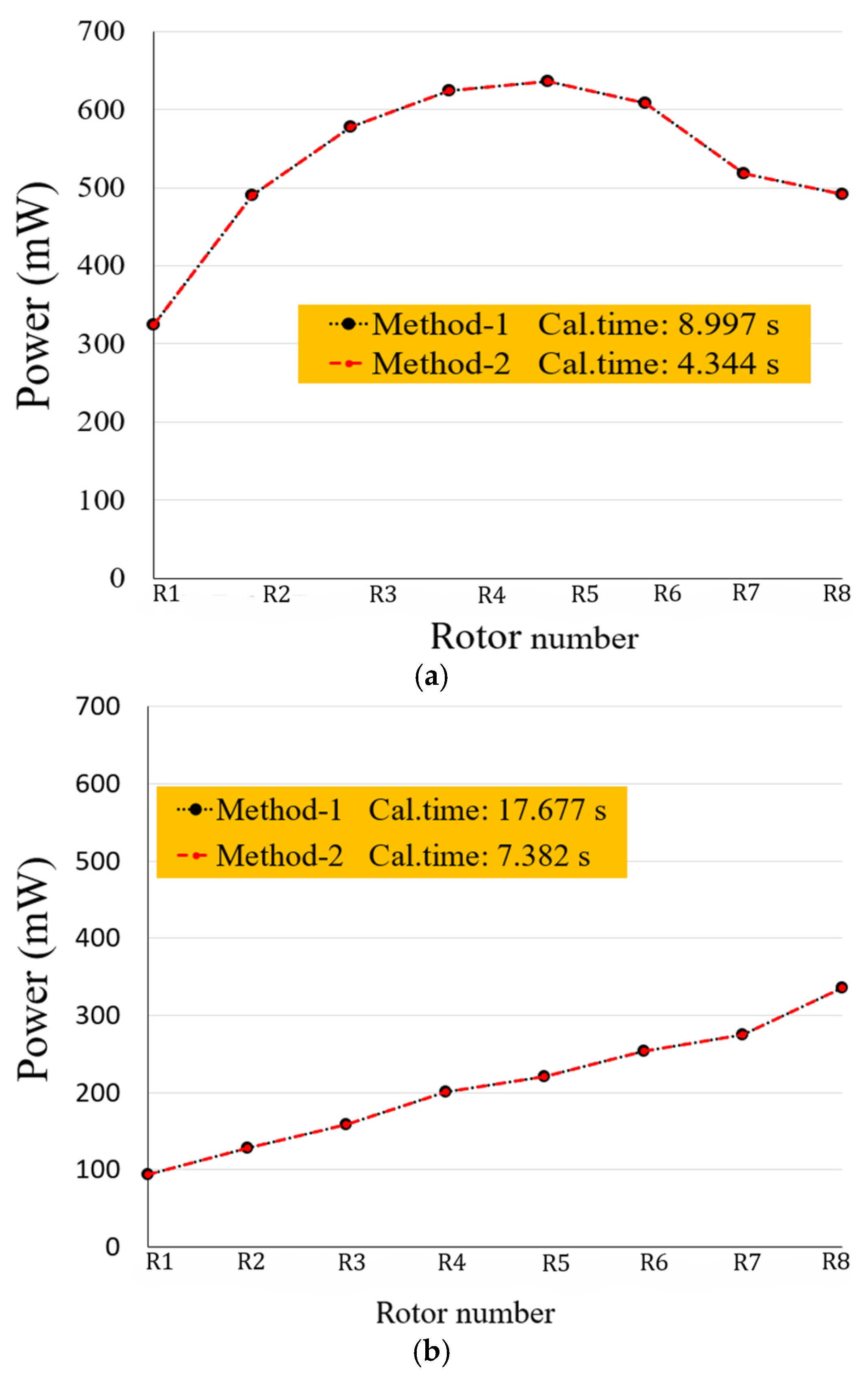 - When the calculation order for the straight-line layout of the eight 2D-VAWT rotors was changed using method-2, the rotor output power was exactly the same, even though the calculation time differed depending on the calculation order.