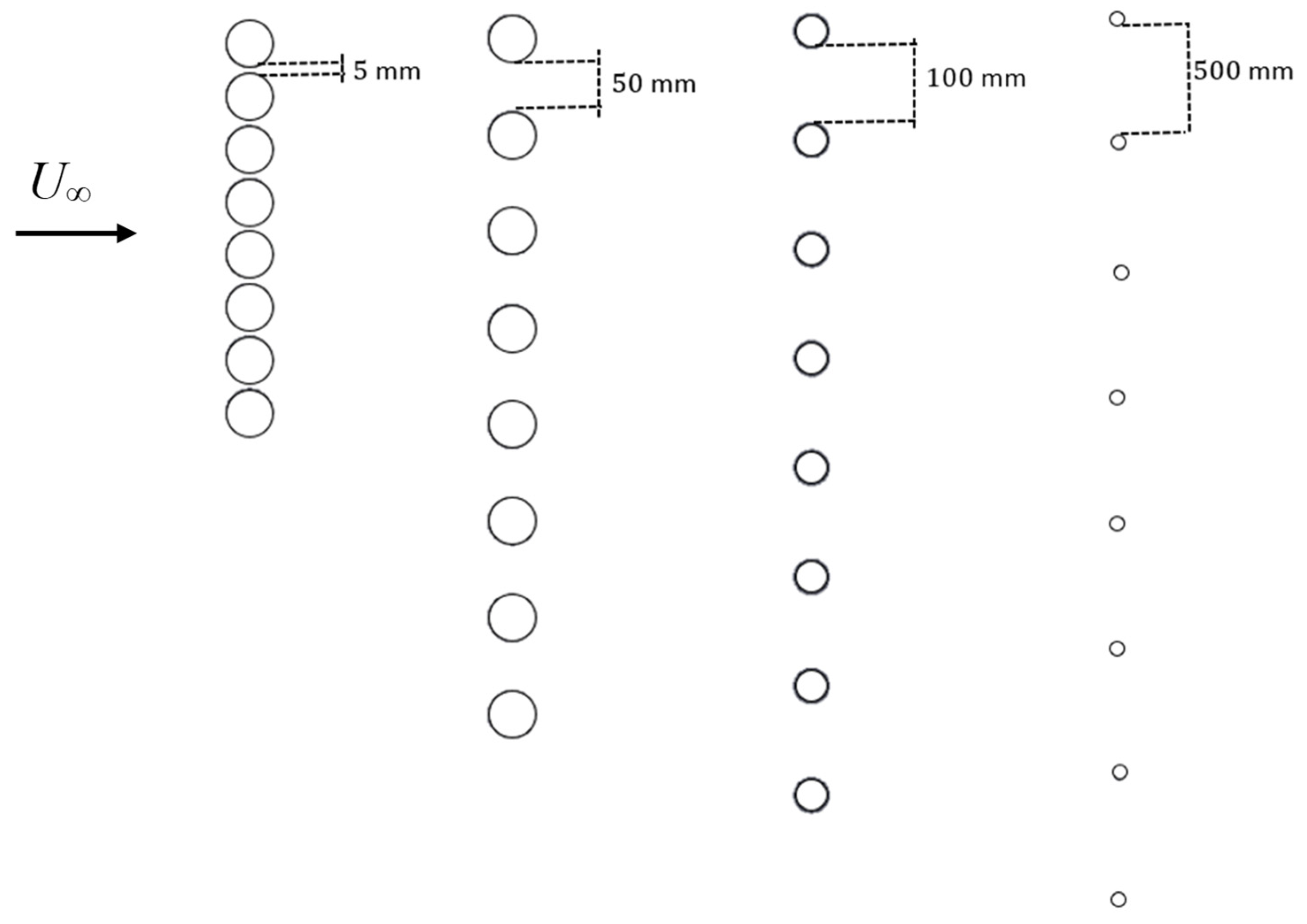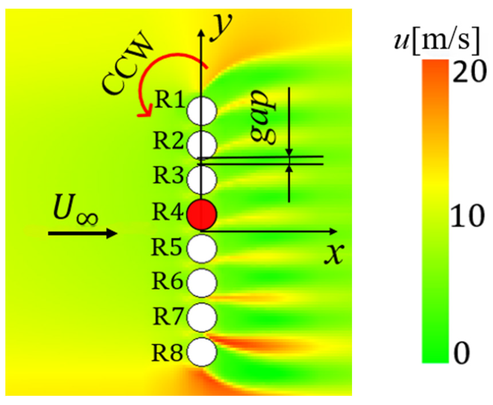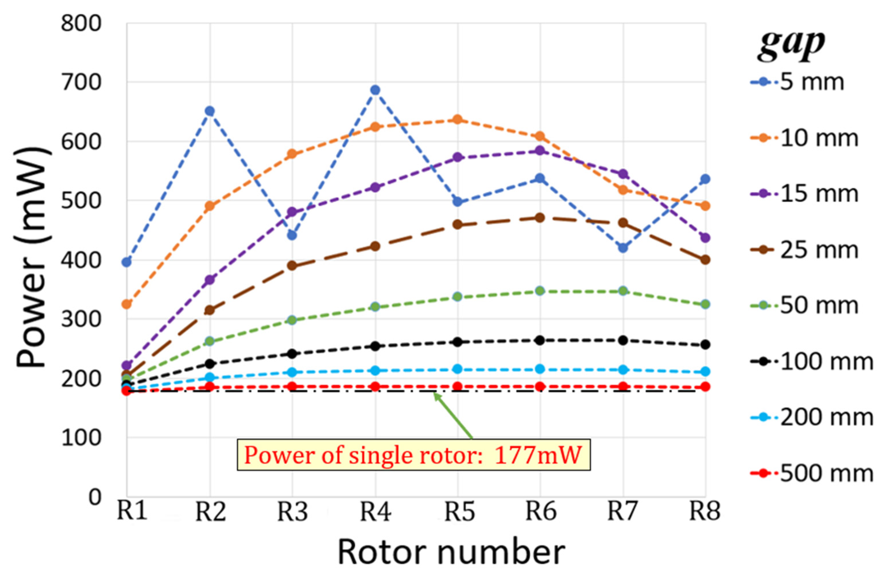 - The power distribution of the eight rotors arranged in parallel in a straight line perpendicular to the main flow approached a constant that equals the power of an isolated single rotor when the inter-rotor distance is as much as ten times the diameter D. However, the power distribution showed relatively large power outputs near the center of the layout when the inter-rotor gap became smaller. For the smallest gap of 5 mm, the power showed uneven distribution.