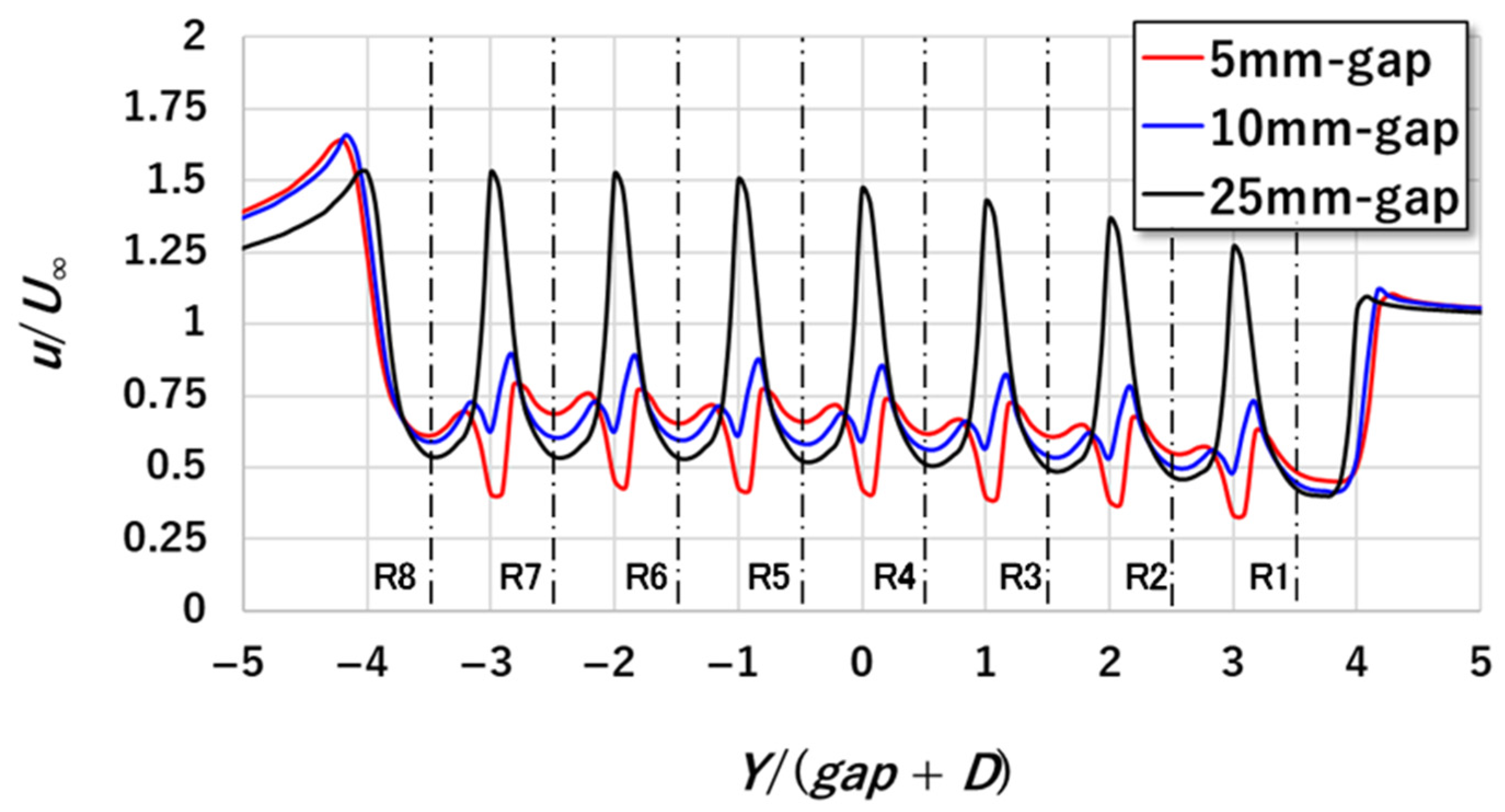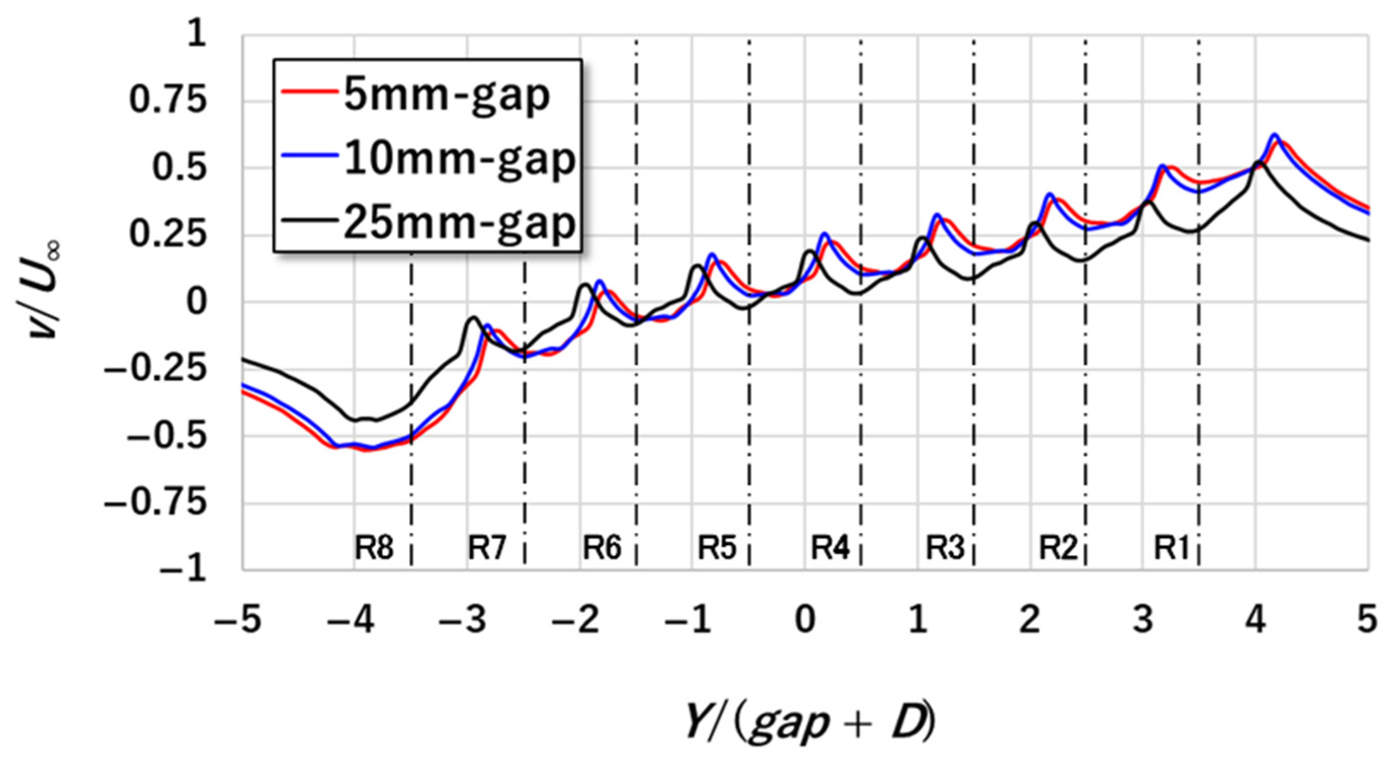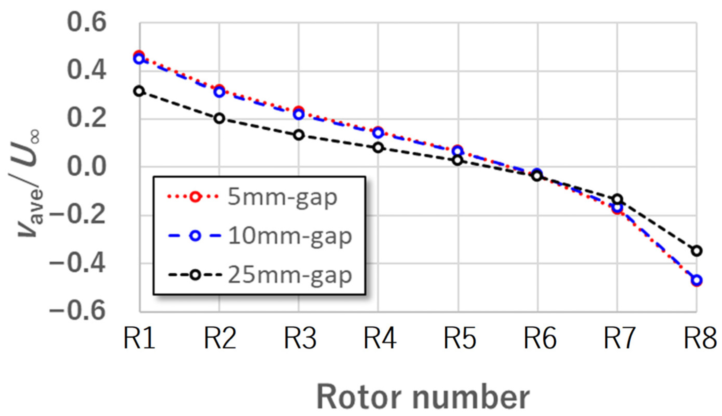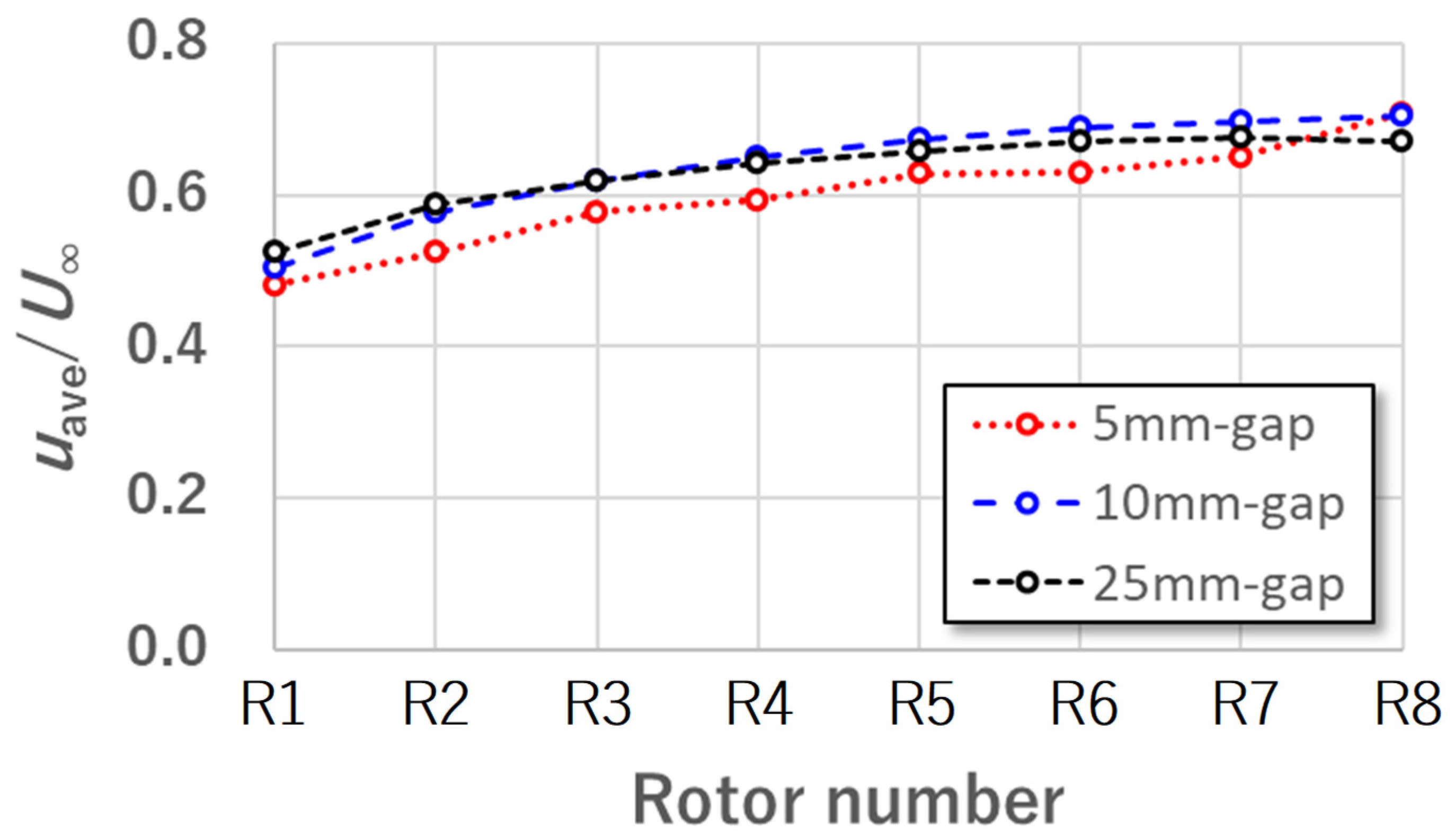 - Two mean velocities, uave (streamwise) and vave (perpendicular), at each rotor center were investigated. However, no behavior was observed that could explain the fluctuation in the power distribution obtained at the minimum inter-rotor gap. It is possible that the local gradient of the streamwise velocity component in the direction perpendicular to the main flow caused the uneven power distribution.