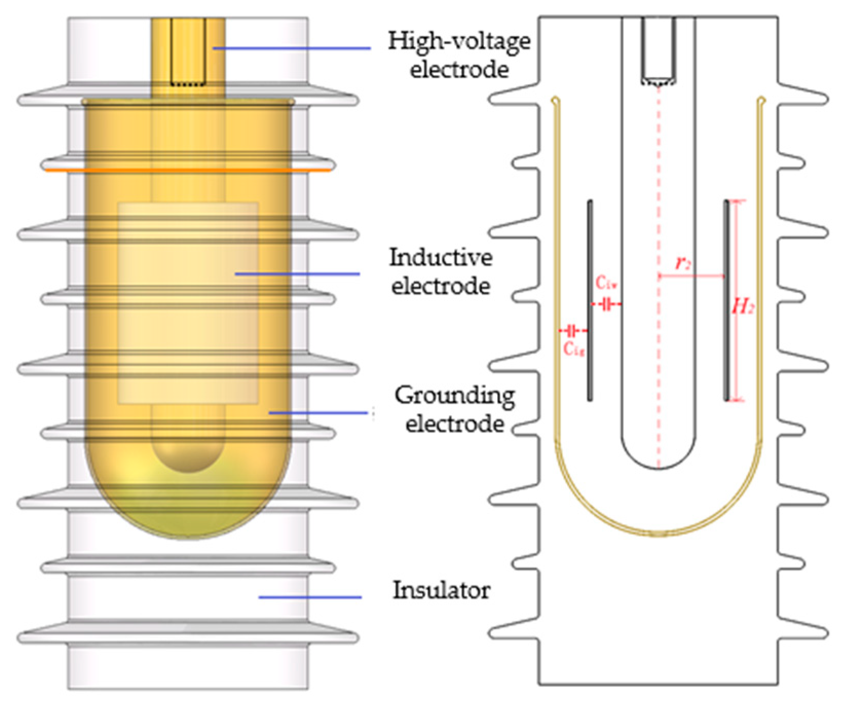 - Huang, J.S.; Liu, H.W.; Tang, Z.; Zhang, C.L. Fault Detection Technology for Distribution Lines Based on Capacitive Voltage Division Embedded in Insulators. Insul. Surge Arresters 2023, 3, 205–212. [Google Scholar] [CrossRef]