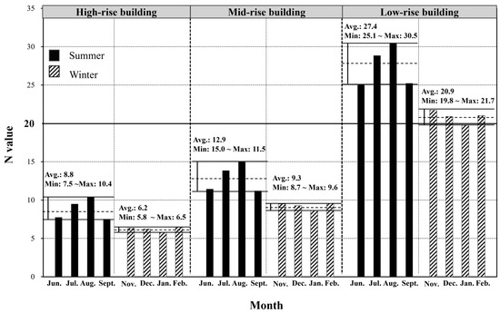 However, as noted in the previous sections, a building’s energy performance is often evaluated using a single representative value for the entire structure. Therefore, it is necessary to determine a building-average conversion coefficient () based on the representative pressure value calculated for the whole building. Figure 5 presents the variation of NAvg across different building heights, using meteorological data from South Korea and a pressure exponent of 0.6. In particular, low-rise, mid-rise, and high-rise buildings correspond to 4-story (12 m), 20-story (60 m), and 45-story (135 m) buildings, respectively. The results indicate that the average for high-rise buildings was 8.8 in summer and 6.2 in winter. For mid-rise buildings, the values were 12.9 in summer and 9.3 in winter, while for low-rise buildings, they were 27.4 and 20.9, respectively. These results demonstrate that low-rise buildings exhibit values more than three times higher than those of high-rise buildings, confirming that varies significantly with the variation in building heights. Furthermore, the average values in summer and winter differed by approximately 20% was observed across all building types.