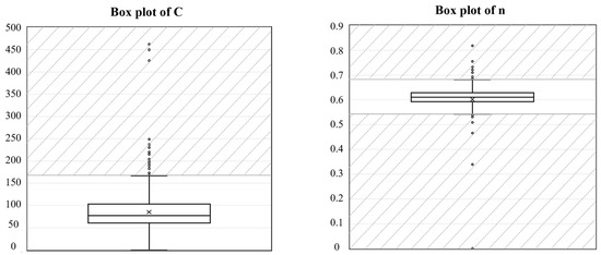Prior to calculating the values using the representative pressure difference, a data preprocessing procedure was conducted. Figure 6 presents the box plots illustrating the distributions of the measured flow coefficient and the pressure exponent for all 1175 samples. As a result of the outlier removal process, a total of 1106 valid data points were selected from the 1175 initial measurement records. The final dataset exhibited a flow coefficient range of 31 to 167 (m3/(s·Pan)) and a pressure exponent range of 0.54 to 0.69.