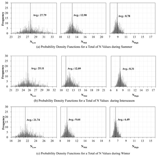 Figure 7 presents the conversion coefficient, derived from the measured airtightness data, as the Probability Density Function (PDF) for summer and winter conditions in Korea. The representative value, obtained through weighted averaging of the measured data, clearly demonstrates a significant dependence on building height. For low-rise buildings, ranged from 23 to 33 in summer, 21 to 30 in interseason, and 21 to 29 in winter. For mid-rise buildings, the ranges were from 10 to 16 in summer, 10 to 15 in interseason, and 8 to 12 in winter. High-rise buildings exhibited the lowest values, ranging from 7 to 11 in summer, 7 to 10 in interseason, and 5 to 8 in winter. As building height increased, not only did the overall values decrease, but the seasonal variation and range of also became narrower. Therefore, applying a conversion coefficient that appropriately reflects both climatic and height characteristics is essential for accurate energy performance evaluations. This finding supports the use of height-specific values in building energy simulations.