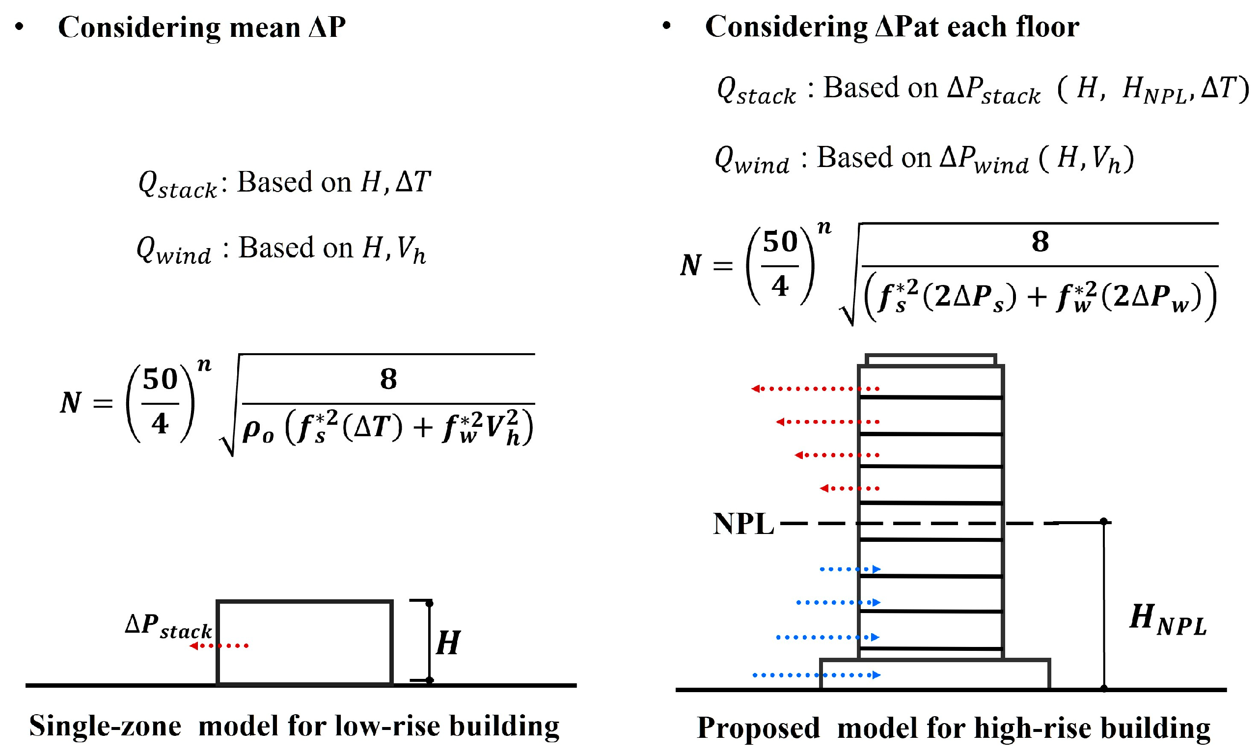 Figure 1 illustrates this conceptual distinction by comparing the traditional single-zone assumption with the proposed multi-floor framework. The figure highlights how the pressure distribution along the building height, including the neutral pressure level (NPL) and its vertical gradient, leads to different infiltration patterns at each floor.