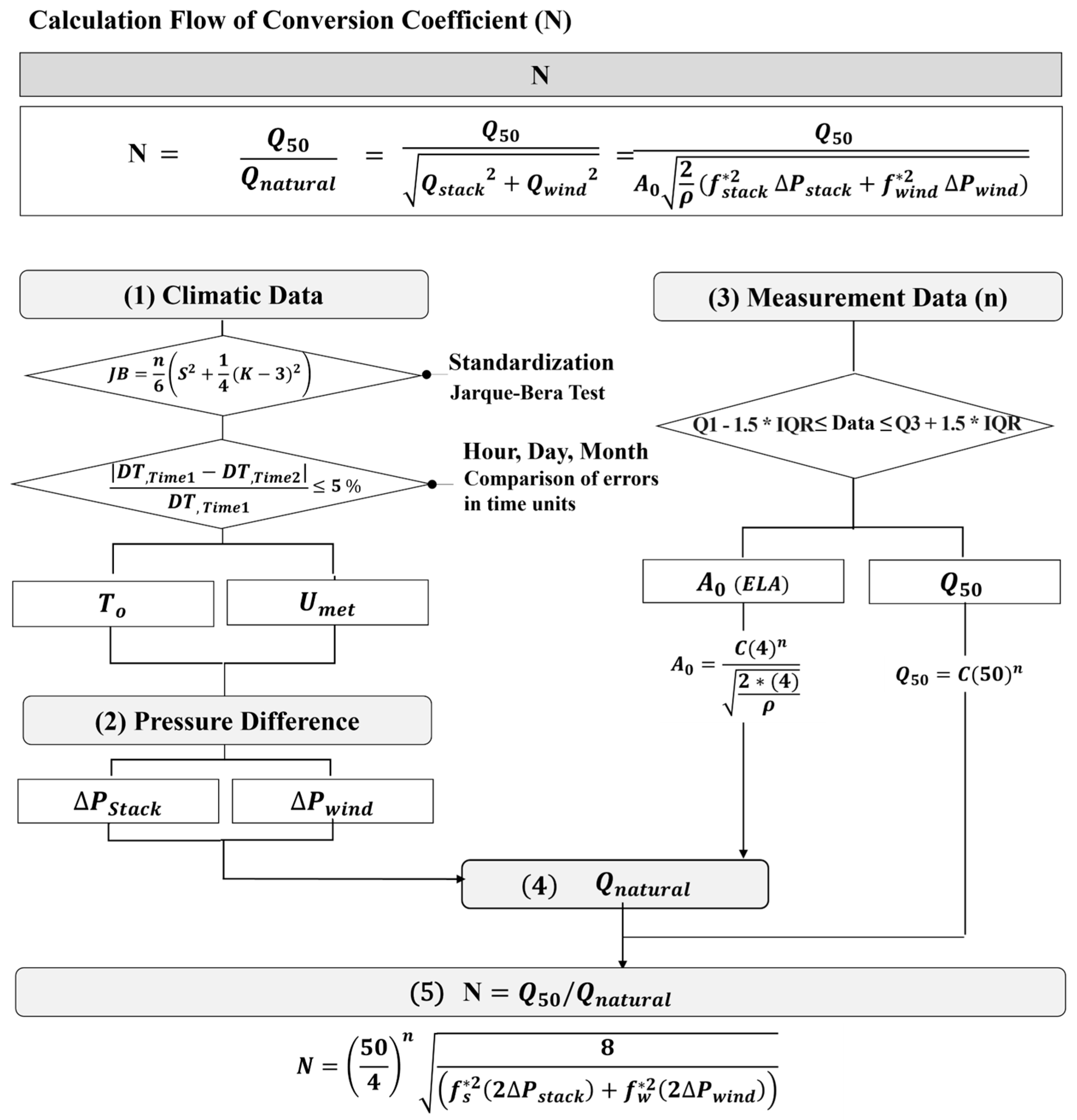 . The procedure is further structured into five main steps: (1) Meteorological Data Processing and Normalization, (2) Selection of Representative Pressure Difference, (3) Preprocessing of Measured Airtightness Data, (4) Calculation of Natural Infiltration Rate, and (5) Derivation of Final Conversion Coefficient. The detailed explanations of each step are shown below.
