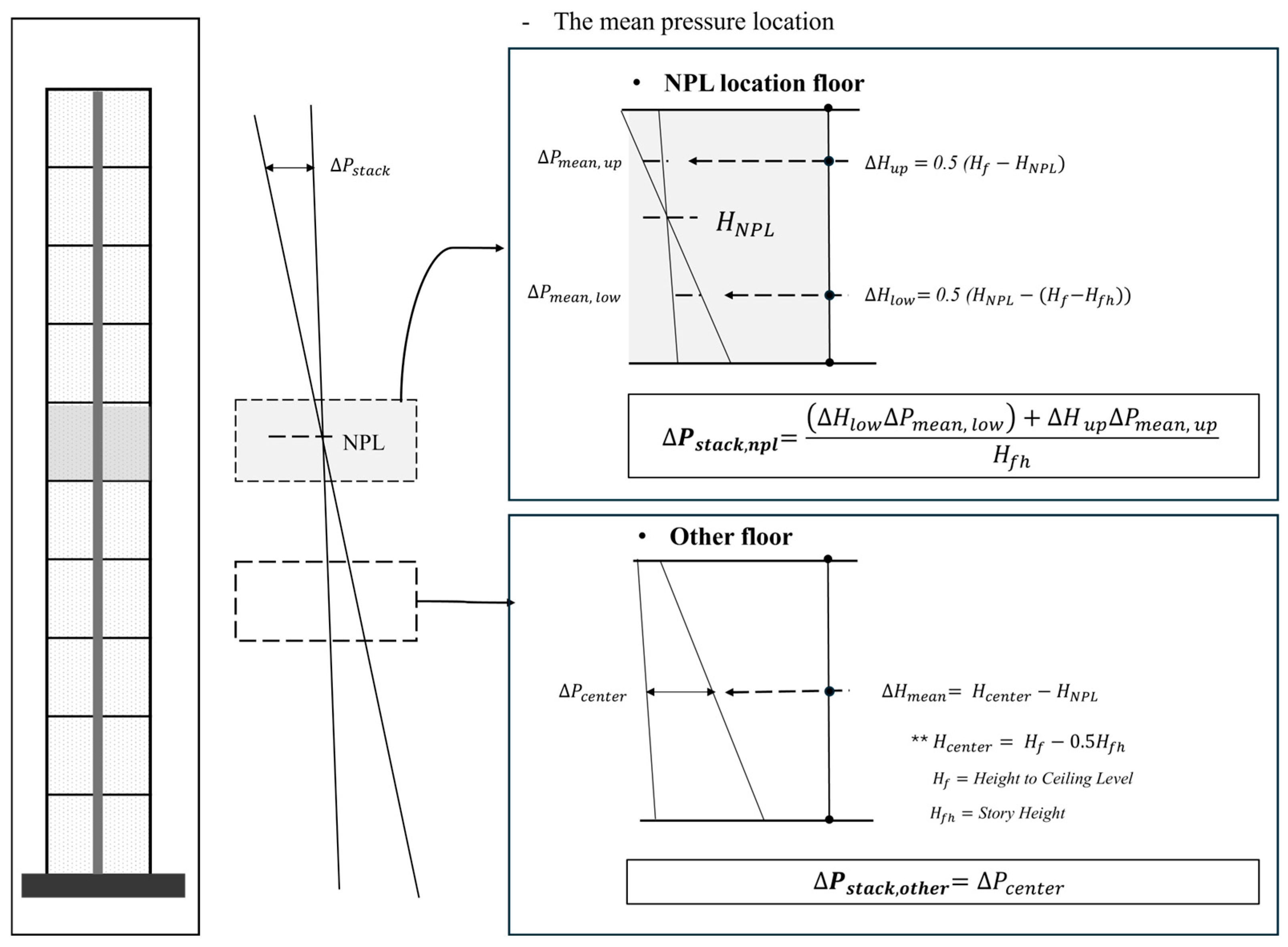 ) were calculated using a model that treats the whole building as a single zone. The overall stack effect pressure distribution for the building is analogous to that of the NPL floor, as the NPL is typically located near the middle of the building height. Accordingly,