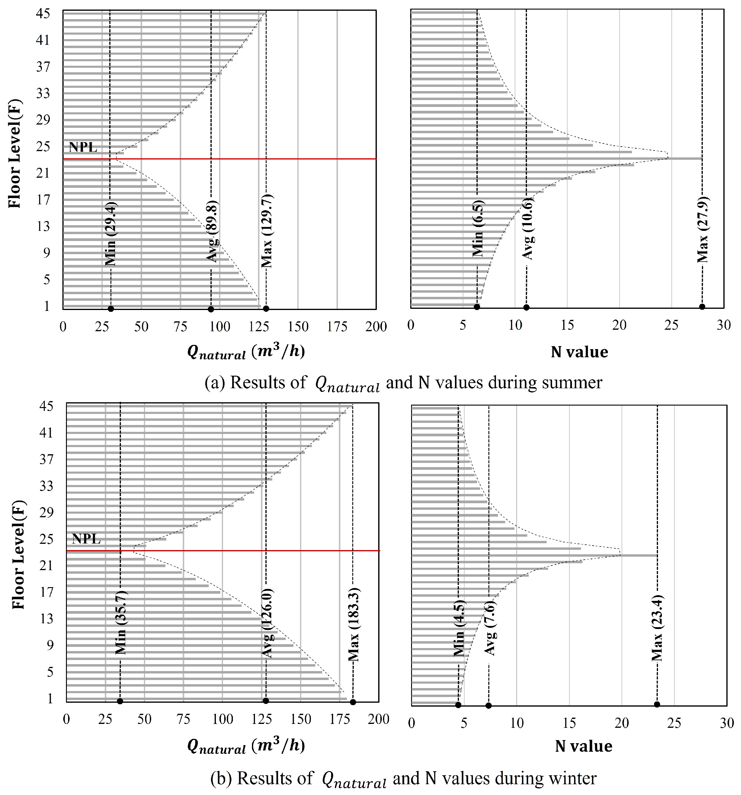 . The seasonal analysis indicated that the natural infiltration rate was generally higher in winter, when the driving force of the stack effect is stronger. The vertical variation of