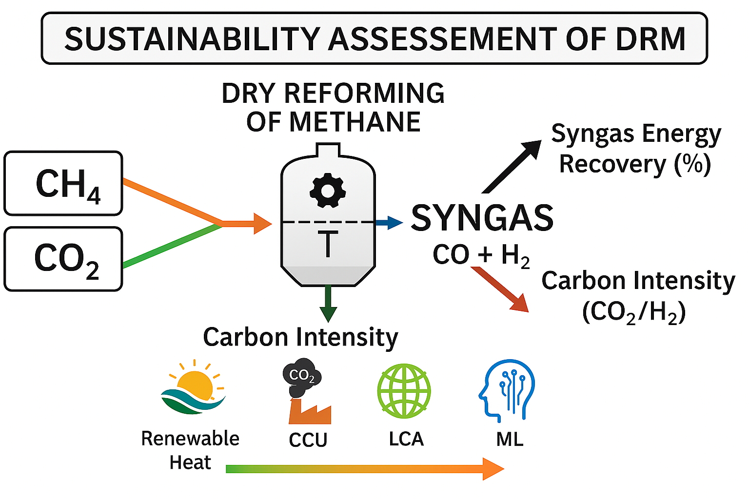 Despite significant advances in catalyst development and reaction kinetics, relatively few studies have examined DRM through a sustainability and systems-engineering lens, integrating life-cycle assessment (LCA), techno-economic analysis (TEA), and data-driven modelling. In particular, the potential of physics-informed machine learning (ML), where thermodynamic and process knowledge constrain predictive models, remains underexplored, especially when combined with uncertainty quantification and scenario-based assessment [
