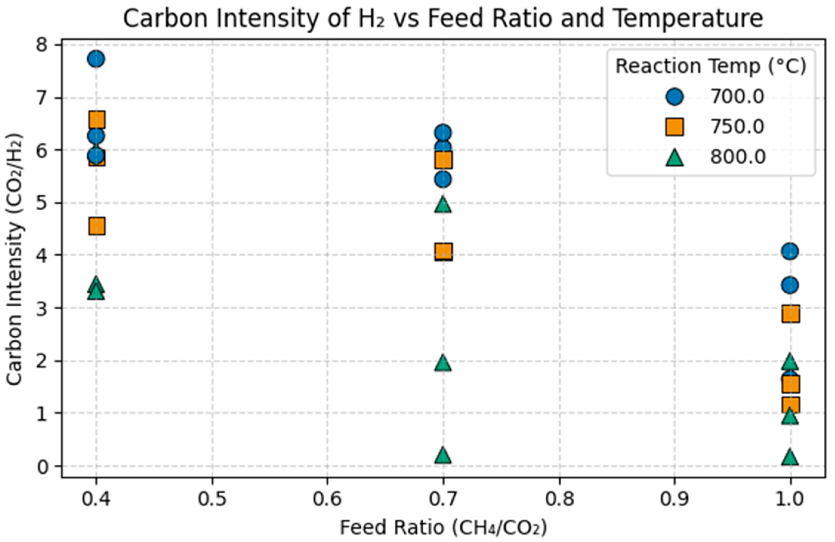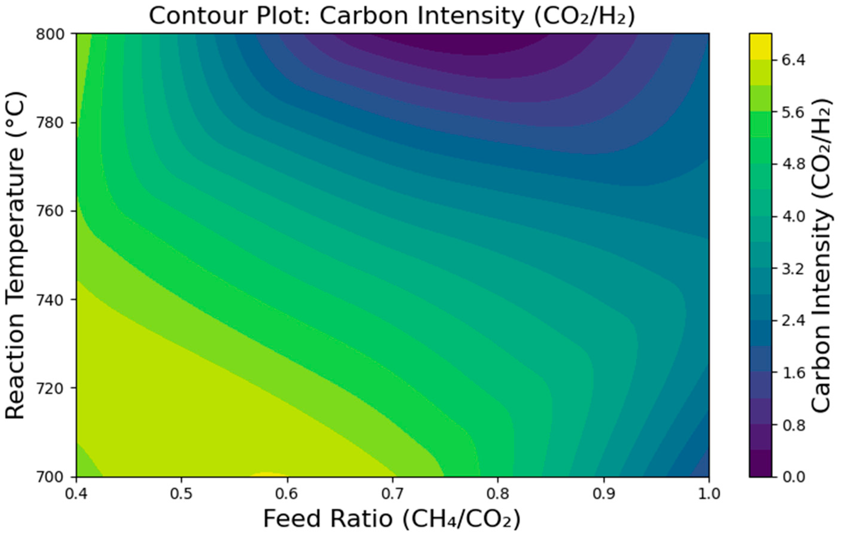 Figure 1) illustrate this trend, with darker regions (low CI) corresponding to high temperatures and balanced feed ratios. Conversely, higher CI values were observed at low feed ratios and temperatures below 750 °C, indicating poor CO