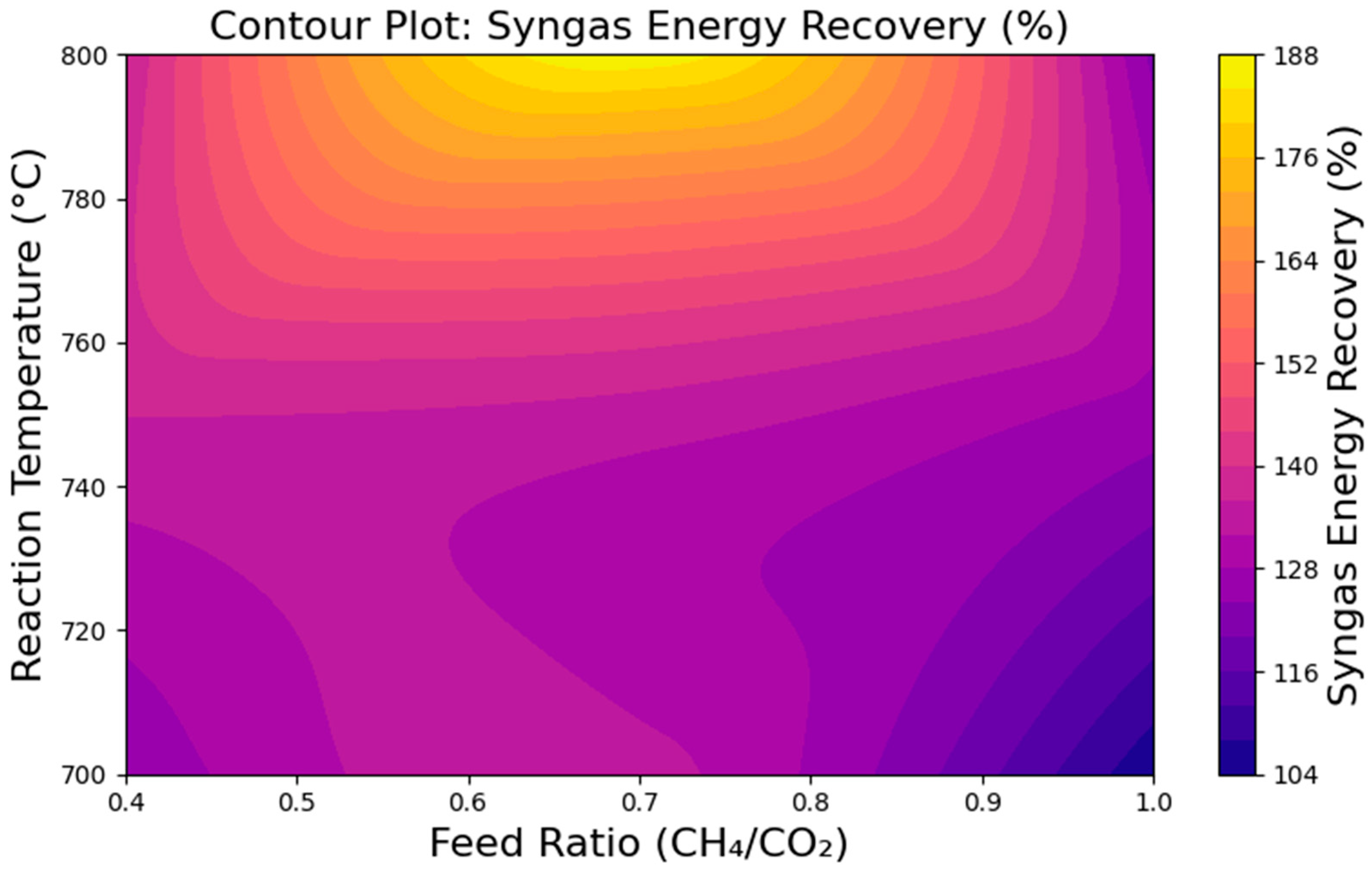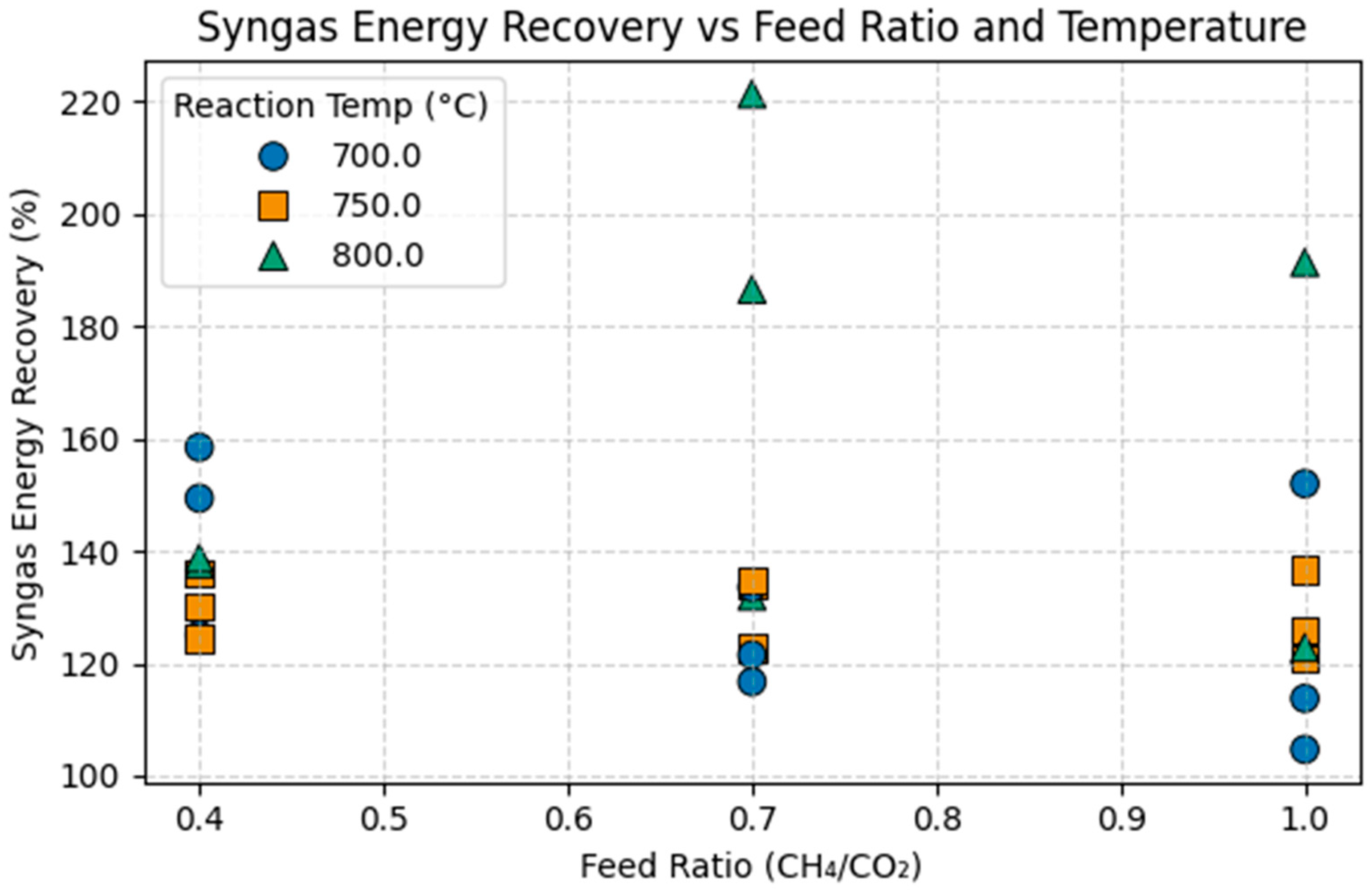 Syngas energy recovery (%) was found to be a dominant feature in physics-informed ML models and sensitivity analyses. While values above 100% are observed, possibly due to the endothermic nature of DRM, the process absorbs heat from the surroundings, resulting in syngas with a higher combined energy content than the methane feed alone.