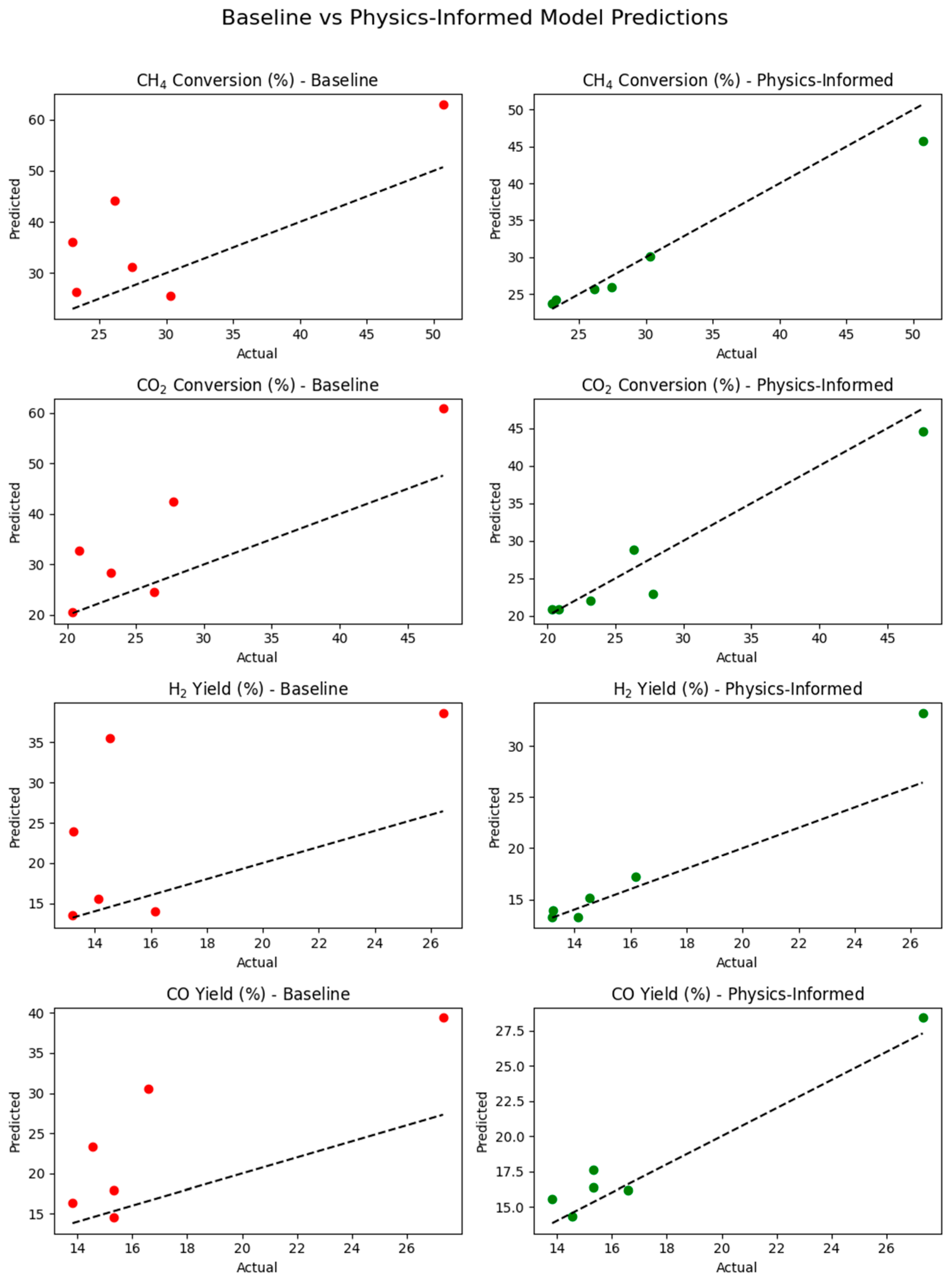 Developing physics-informed ML models that incorporate thermodynamic and sustainability features to predict CH4/CO2 conversion and syngas yields;