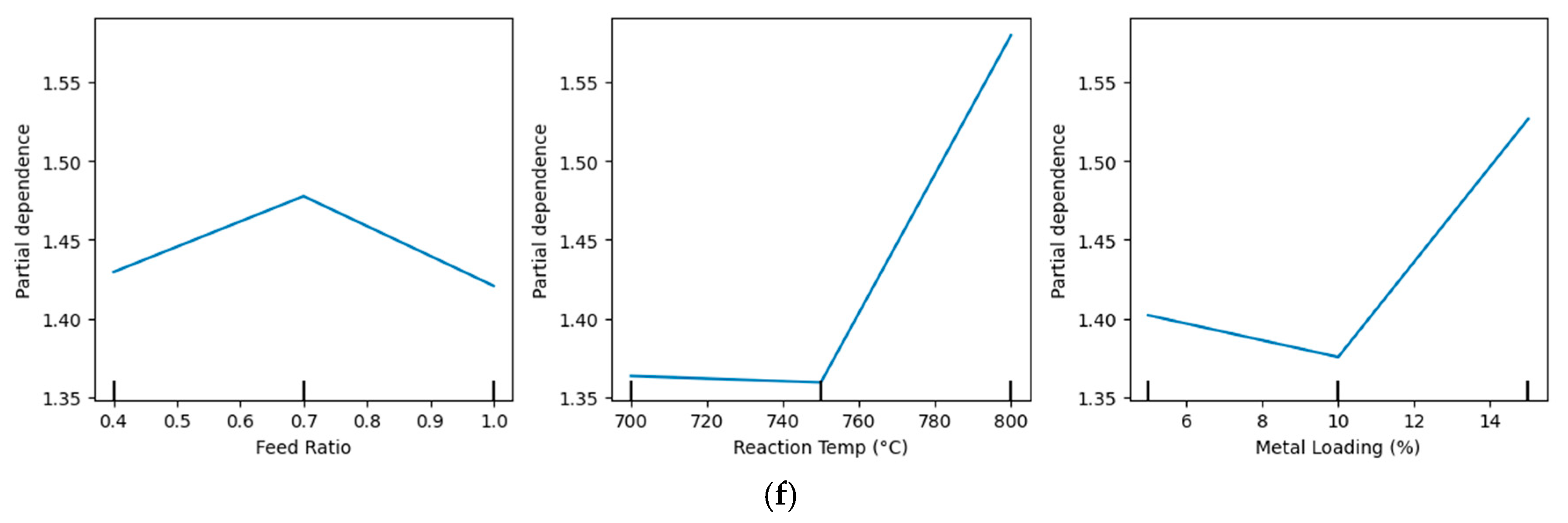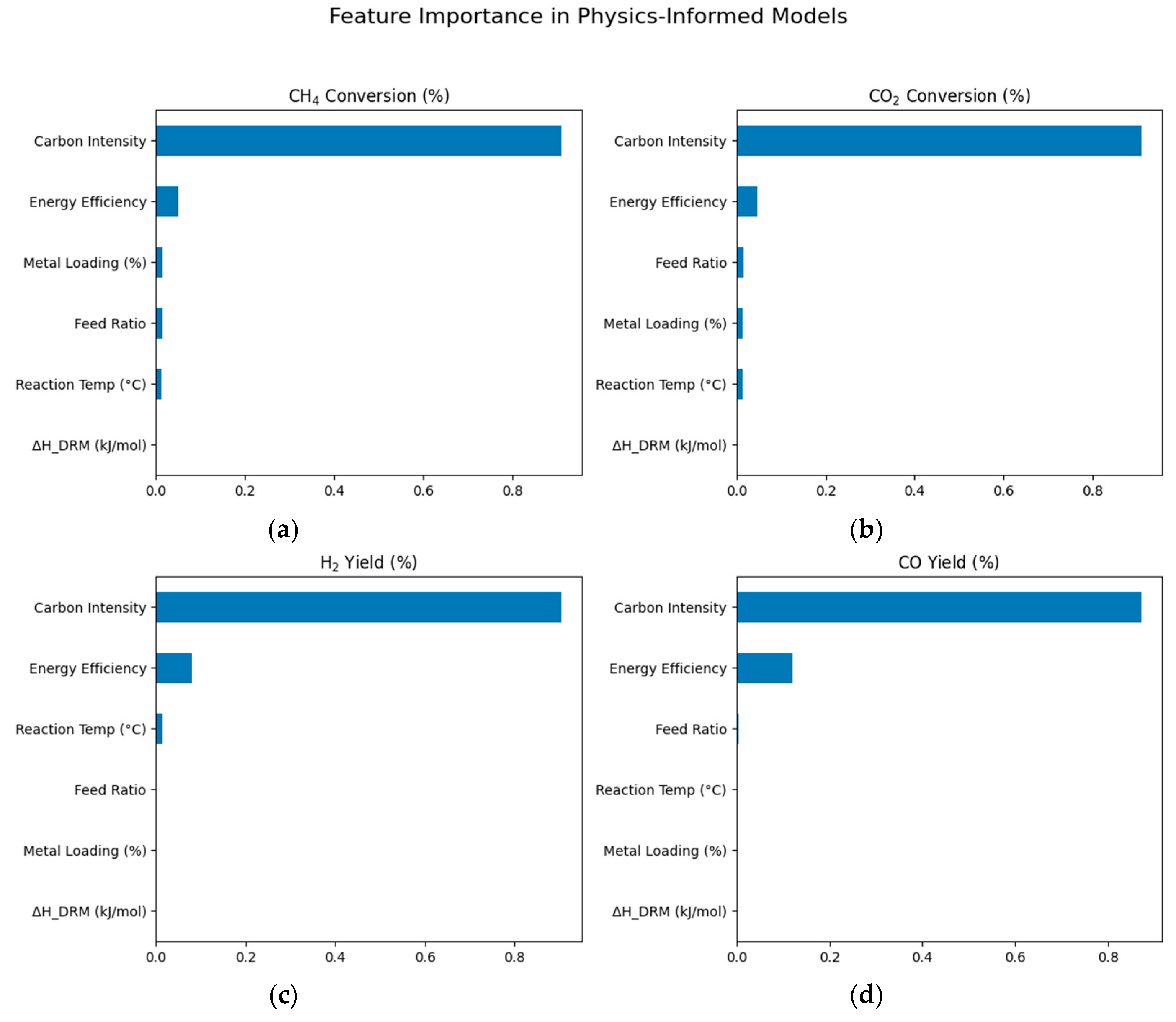 The physics-informed ML framework captured the nonlinear dependencies among feed ratio, temperature, and catalyst loading more accurately than traditional kinetic models. By embedding thermodynamic quantities and sustainability features, such as reaction enthalpy, carbon intensity, and syngas energy recovery (%), the ML models achieved both high predictive accuracy and interpretability. Feature importance analyses consistently identified carbon intensity, reaction temperature, and syngas energy recovery (%) as dominant drivers, confirming that data-driven models grounded in physical principles can generalize effectively while retaining scientific relevance [