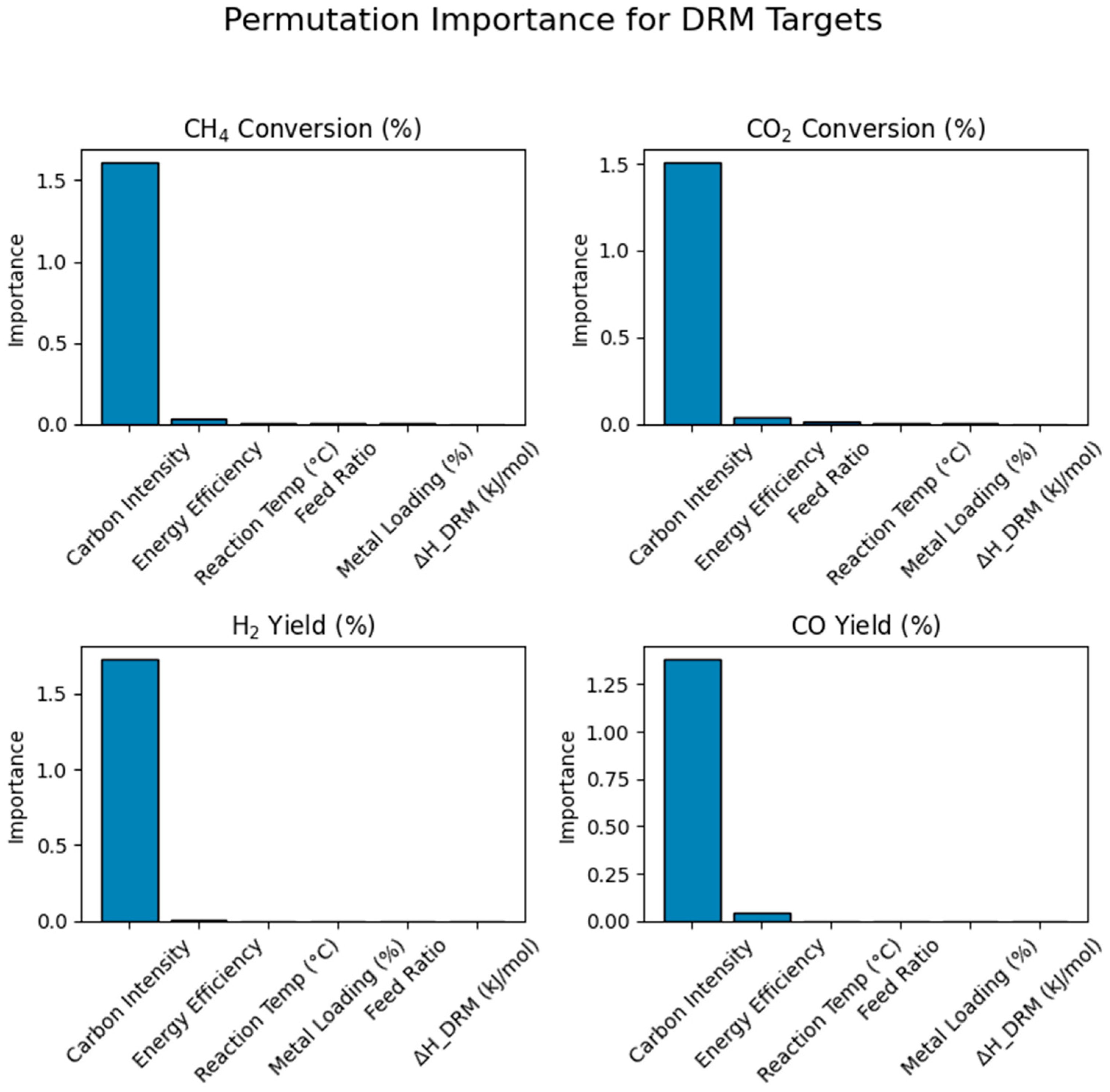 These results highlight the importance of both thermal input and reactant balance in minimizing the carbon footprint of hydrogen production via DRM. Incorporating CI as a sustainability metric, alongside thermodynamic features such as reaction enthalpy, improves the interpretability and relevance of the machine learning models in this study [
