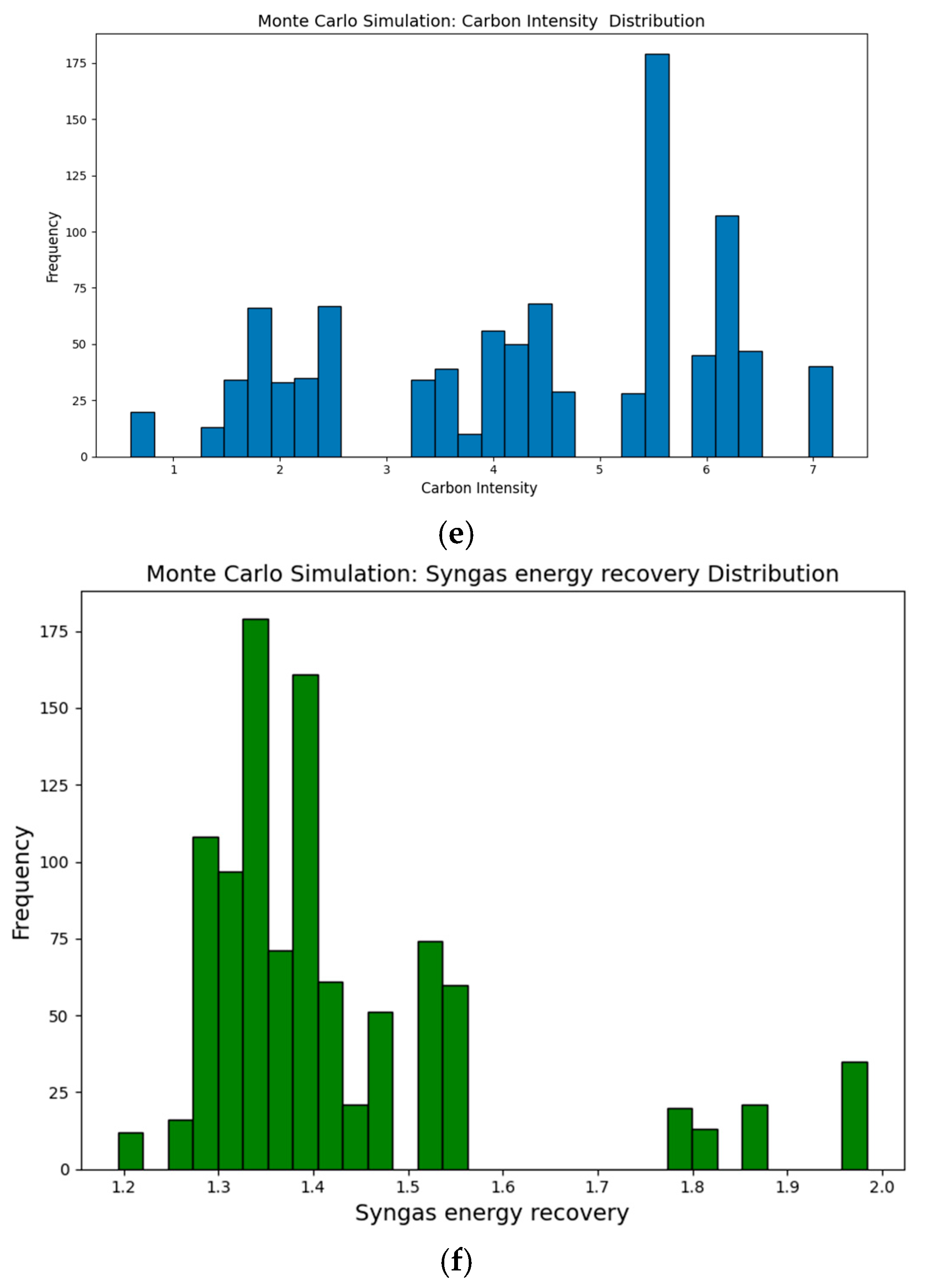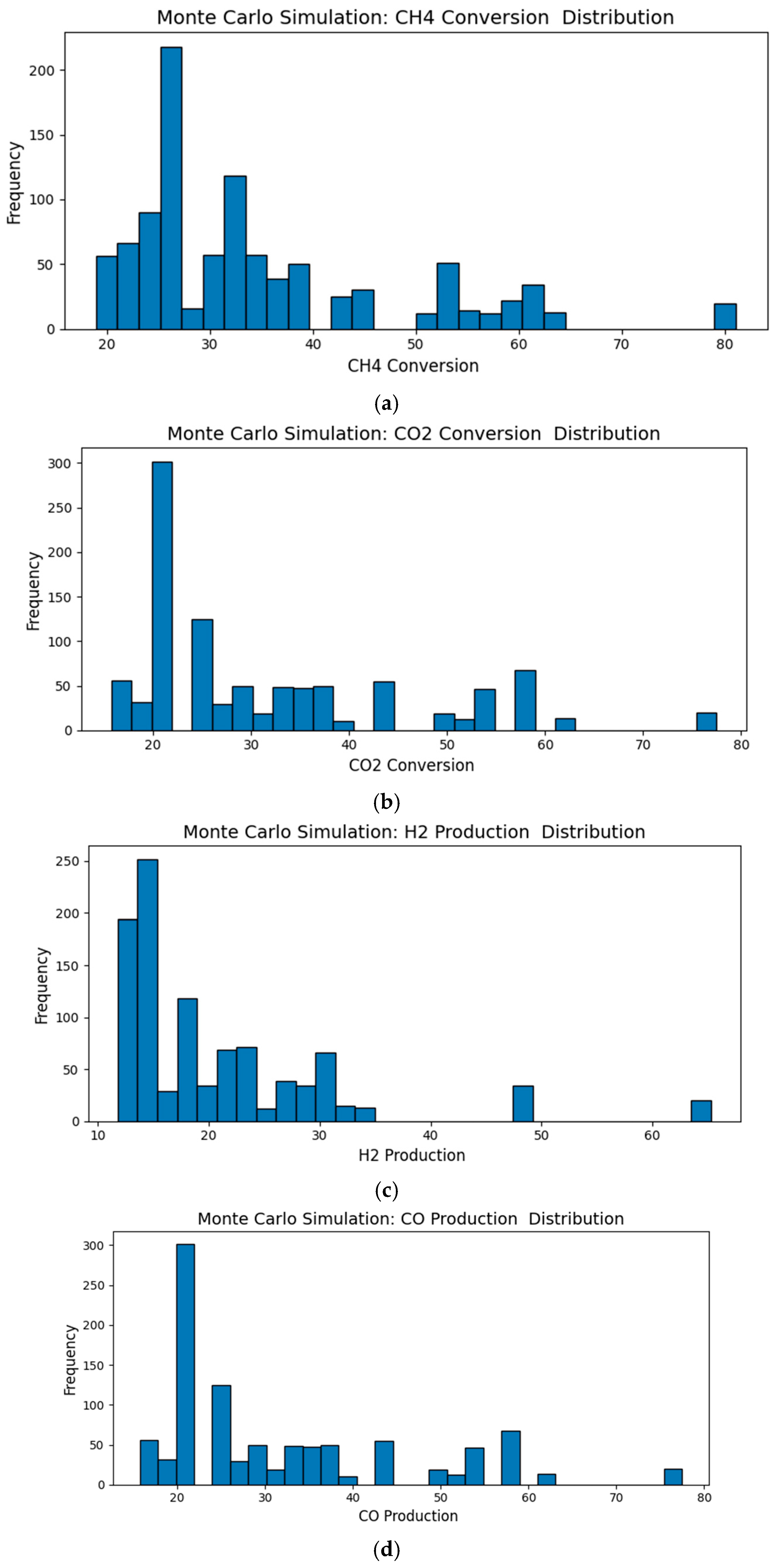 29]. Under optimized conditions, DRM achieved carbon intensities as low as 0.17 and syngas energy recovery values approaching 95%, surpassing those of conventional Steam Methane Reforming (SMR). Monte Carlo and scenario analyses revealed distinct operating clusters rather than a single performance continuum, highlighting the presence of stable high-yield regimes that can guide industrial process control [