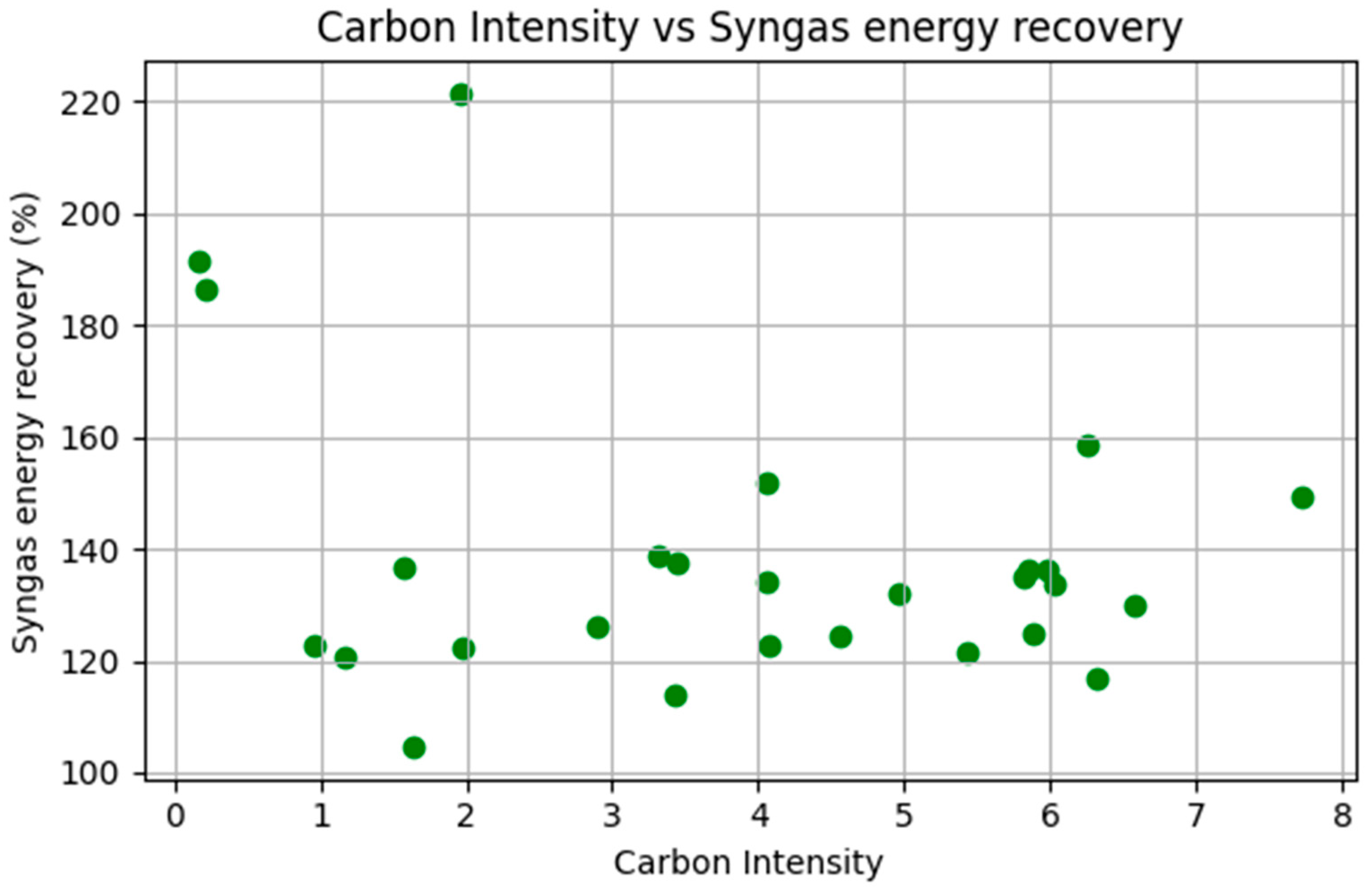 In the experimental dataset, syngas energy recovery values ranged from 104.68% to 191.35% (